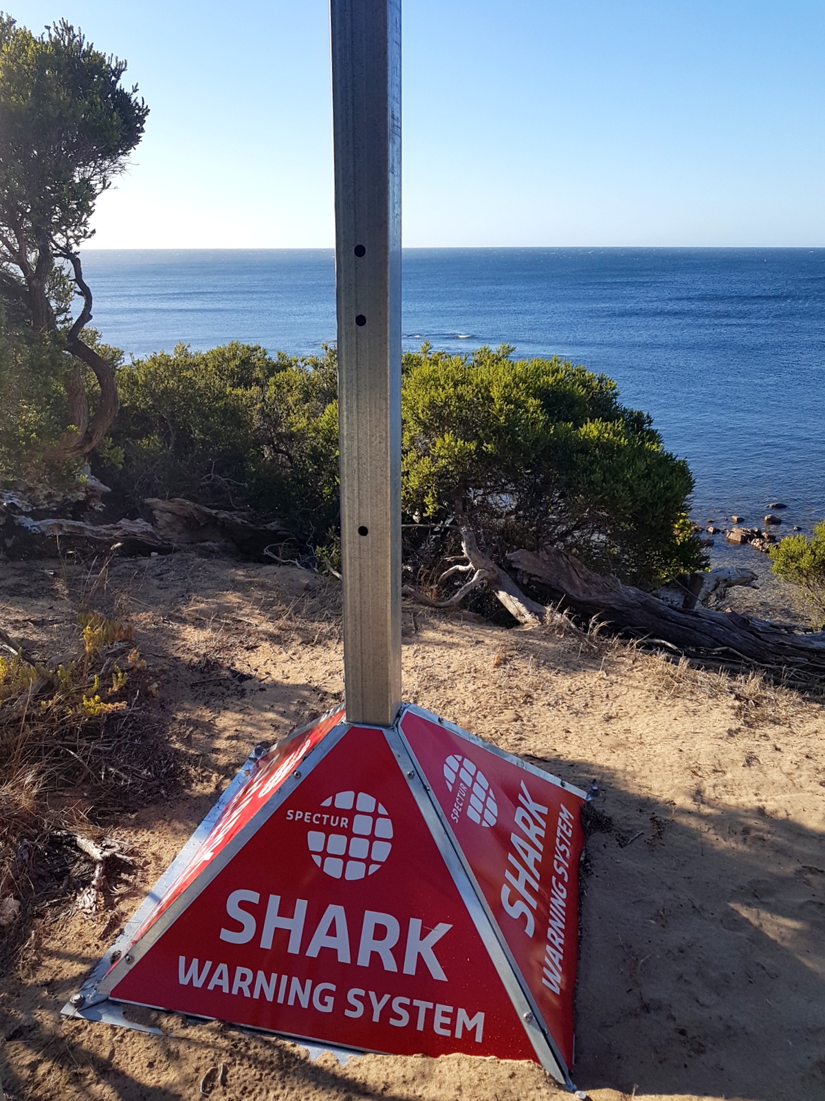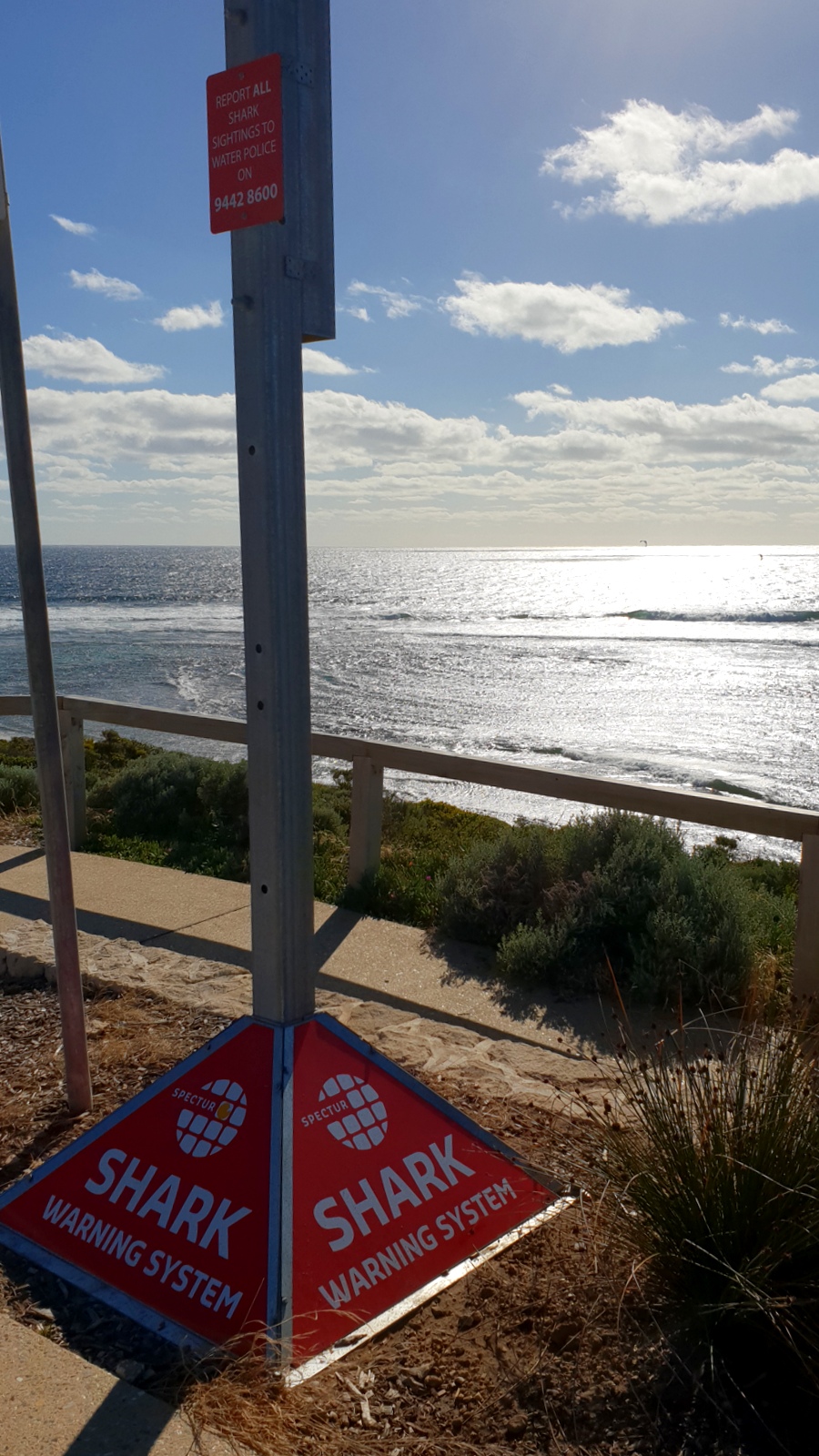 On découvre les dispositifs anti-requins qui sont installés sur le site, peu engageant pour la baignade… déjà que l’eau est beaucoup trop froide pour moi…