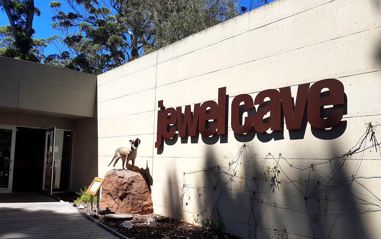 On y a retrouvé des squelettes de THYLACINES (tigres de Tasmanie), une espèce qui a disparu d’Australie il y a 2 000 ans environ et dont l’extinction a été officielle en 1936! D’après ces squelettes, un spécimen a été reproduit et exposé à l’entrée de l’Interpretive Centre.