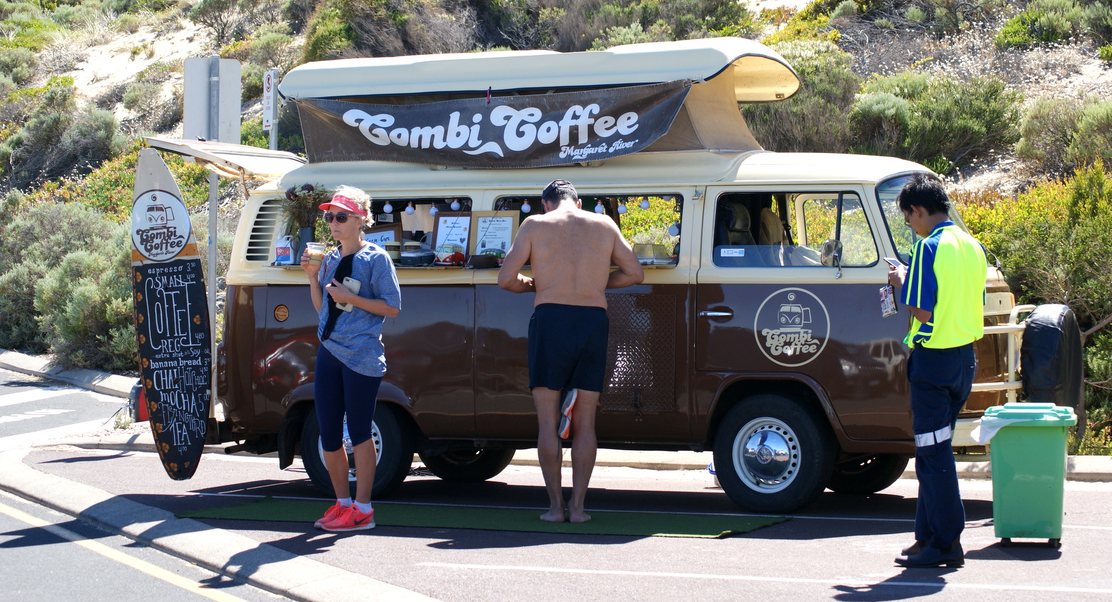 Dès le matin, un food-truck dans un combi vW vintage s’installe sur le parking où visiblement les surfeurs (et les spectateurs…) apprécient de prendre un café après leur session…