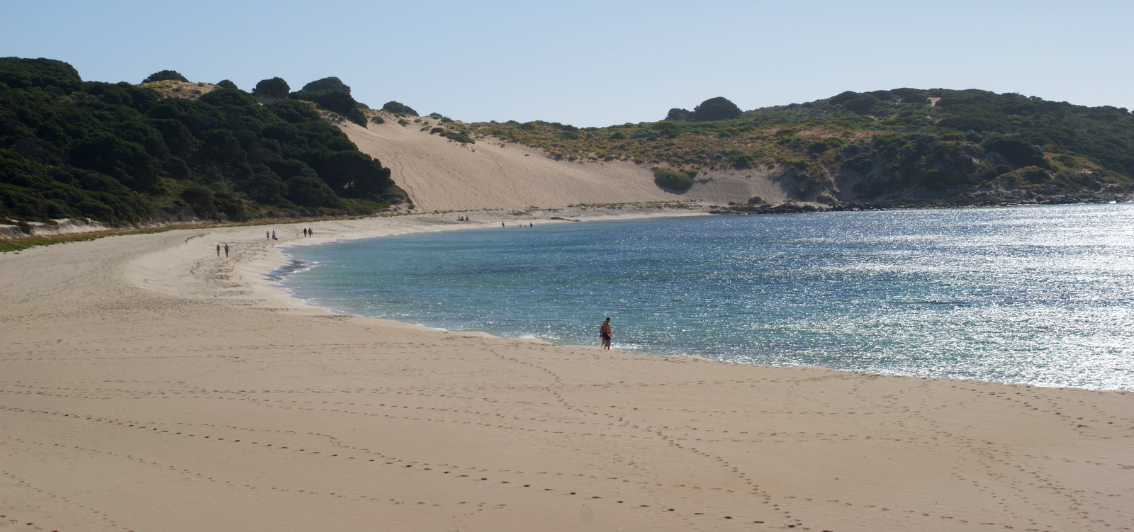 Une longue plage de sable blanc encadrée de dunes propice au surf et à la baignade…