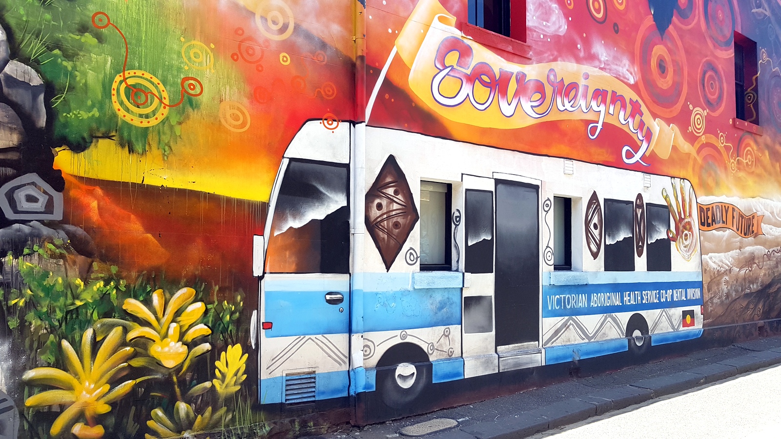 Malheureusement, il était fermé pendant la période des fêtes et je n’ai pu qu’admirer l’immense fresque murale remplie de symboles aborigènes peinte sur le côté de cette ancienne banque reconvertie!