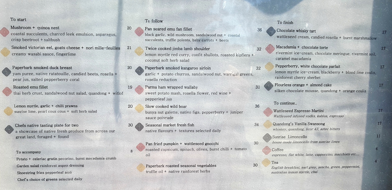 Dommage car je me régalais déjà de goûter à la cuisine inventive d’un chef qui travaille les produits natifs souvent inconnus de nos papilles européennes! Y sont proposés des viandes locales: kangourou, wallaby, émeu cuisinés avec des herbes et épices endémiques mais ne vous inquiétez pas, si vous n’êtes pas très porté sur la viande comme moi, on y trouve également de surprenants plats végétariens…