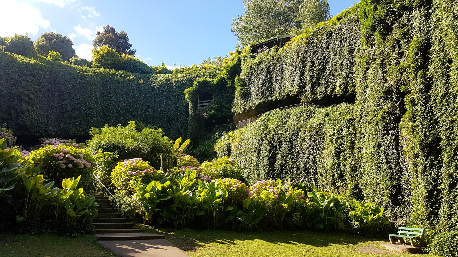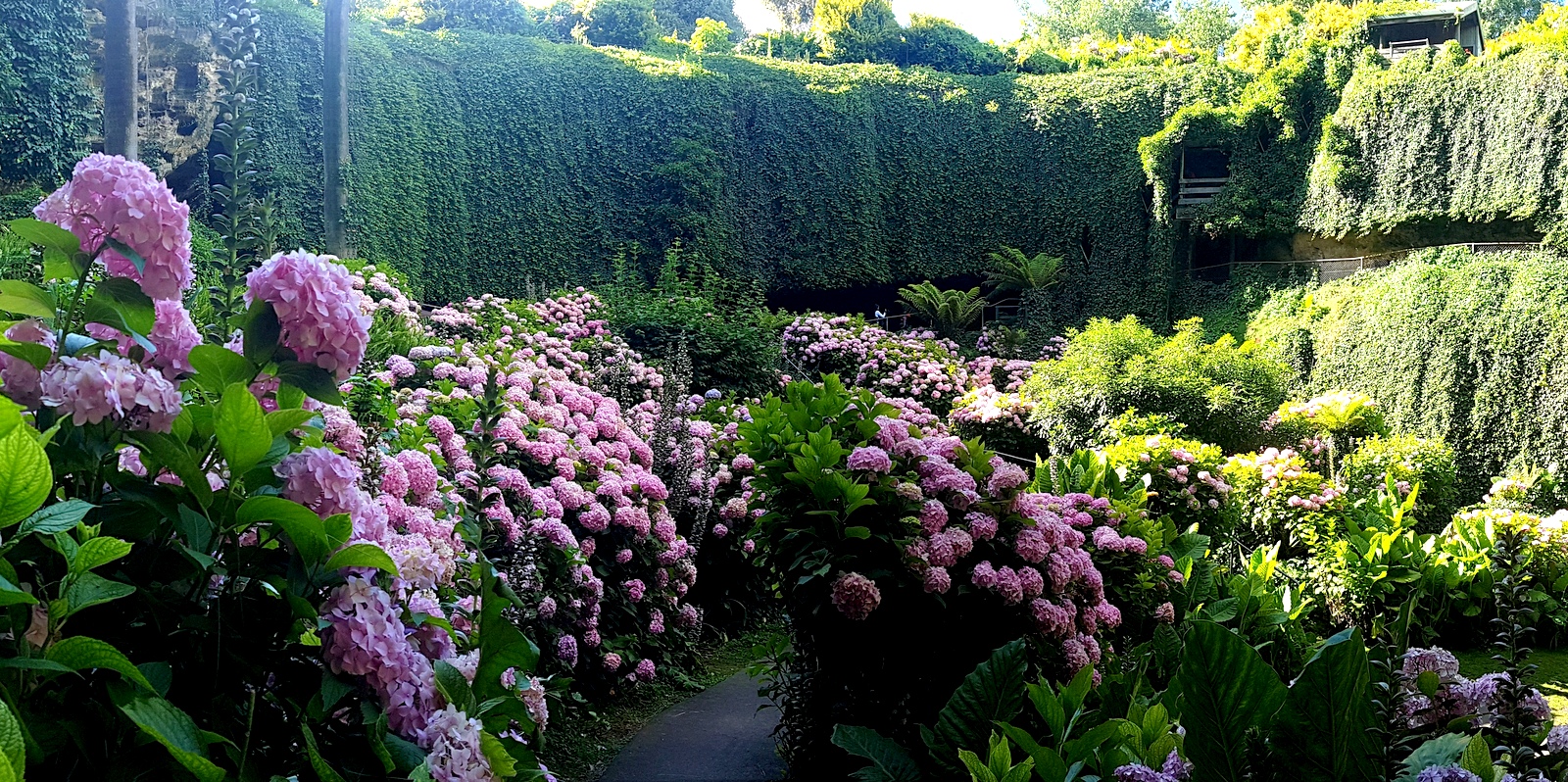 Si la végétation est luxuriante, il est planté, majoritairement, d’hortensias qui fleurissent en début d’été, la meilleure période pour l’admirer dans sa pleine floraison est donc en janvier quand on y était… Et quelle splendeur!!! Entre les parois de la caverne couvertes de lianes, les fougères géantes, les innombrables bosquets d’hortensias, les oiseaux (qui doivent se penser au paradis!)…, on ne peut que se poser sur un des nombreux bancs et admirer…