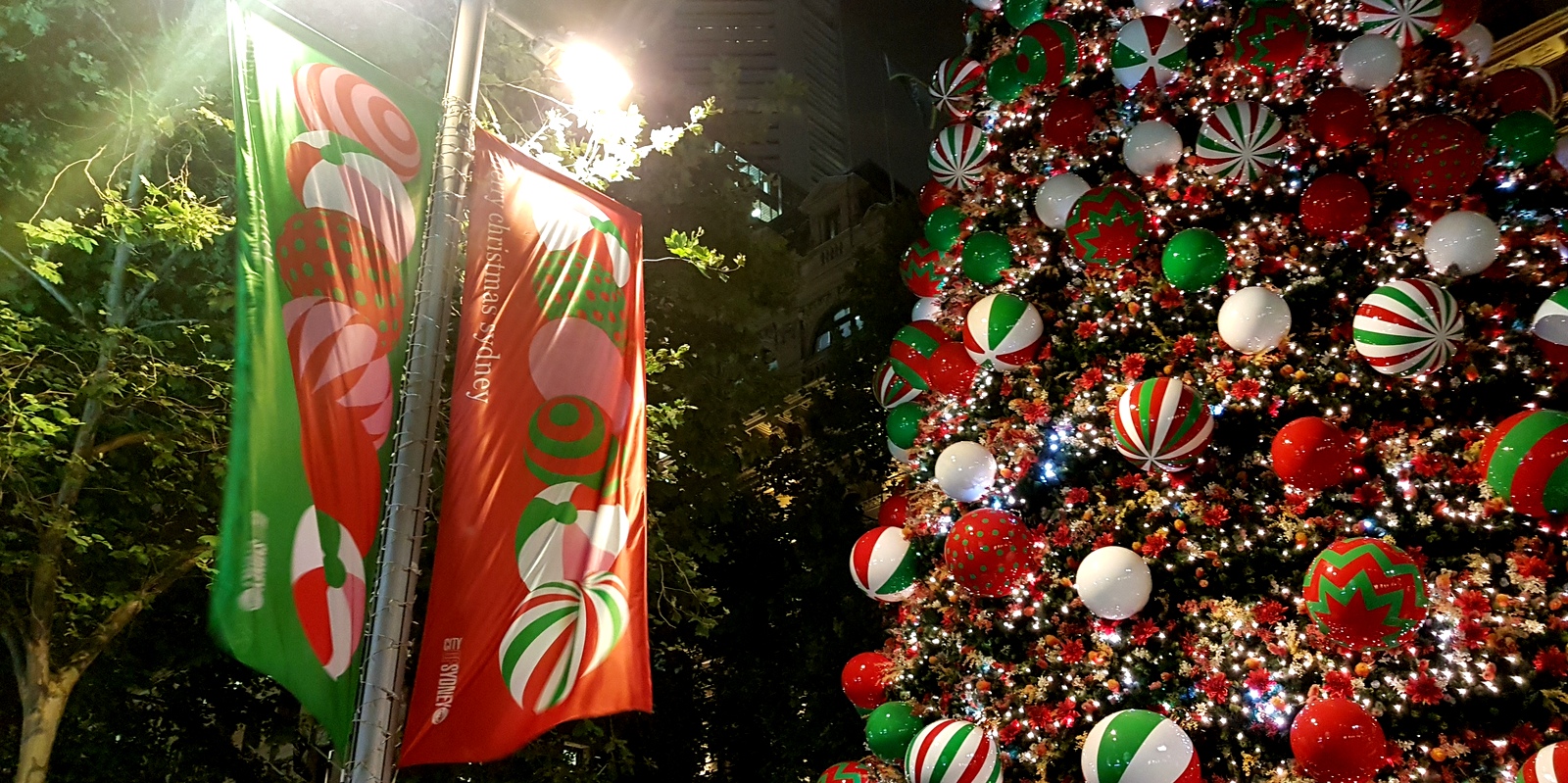 Ce n’est pas parce qu’on est en plein été avec des températures qui dépassent largement les 30°C que Noel n’est pas fêté en Australie !!! Pour l’occasion, Sydney se pare de décorations à partir de fin novembre et c’est vrai que, pour nous Européens, assister à toutes ces festivités en tenue légère, voire en maillot de bain sur la plage est peut-être un peu moins magique mais tellement plus exotique !!!