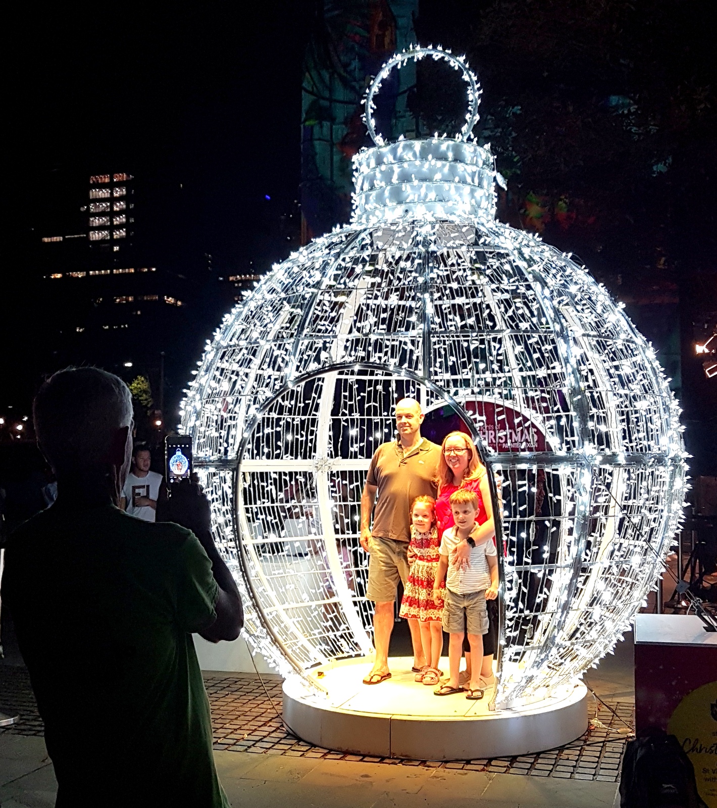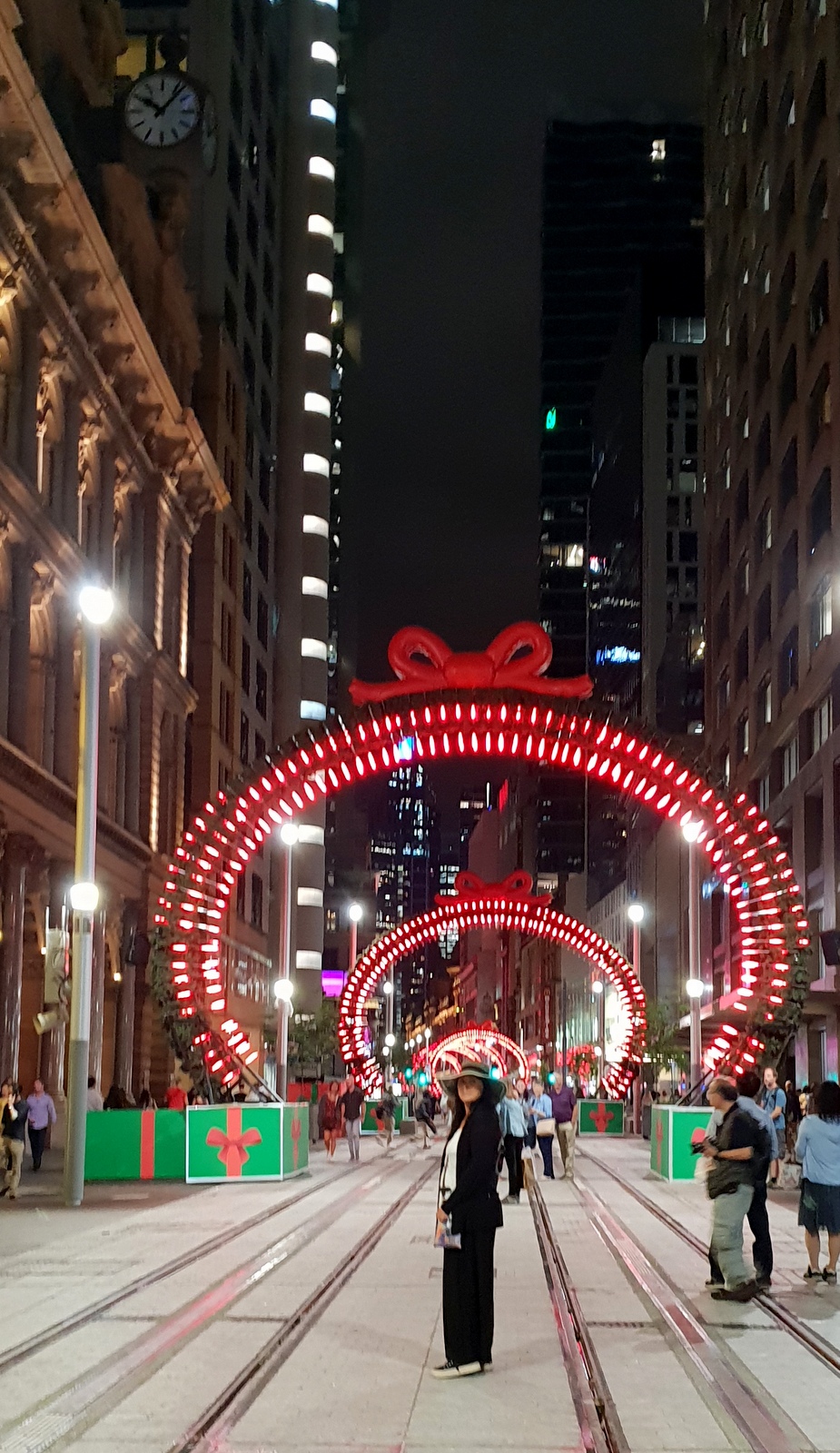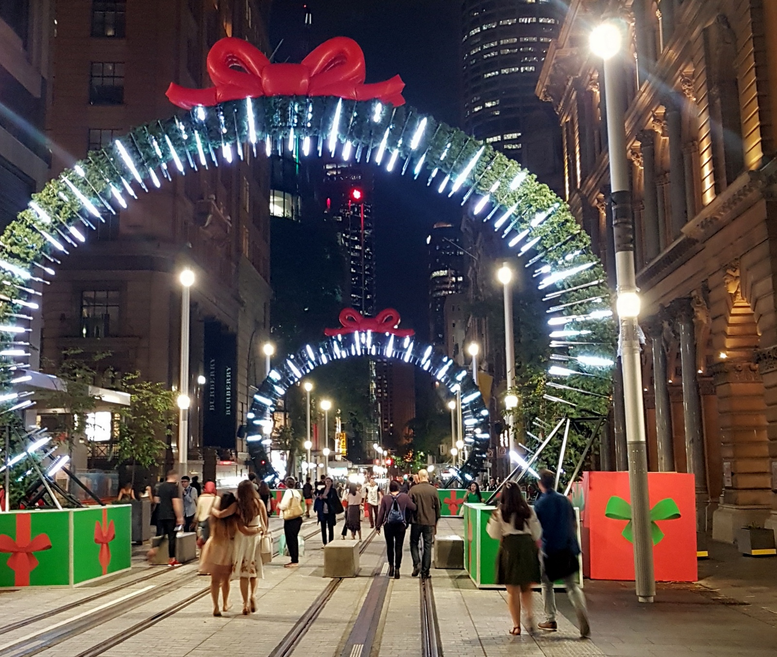 Sur George Street, ce sont 8 gigantesques couronnes qui changent de couleur, des arches et d’énormes cadeaux emballés qui décorent la rue…