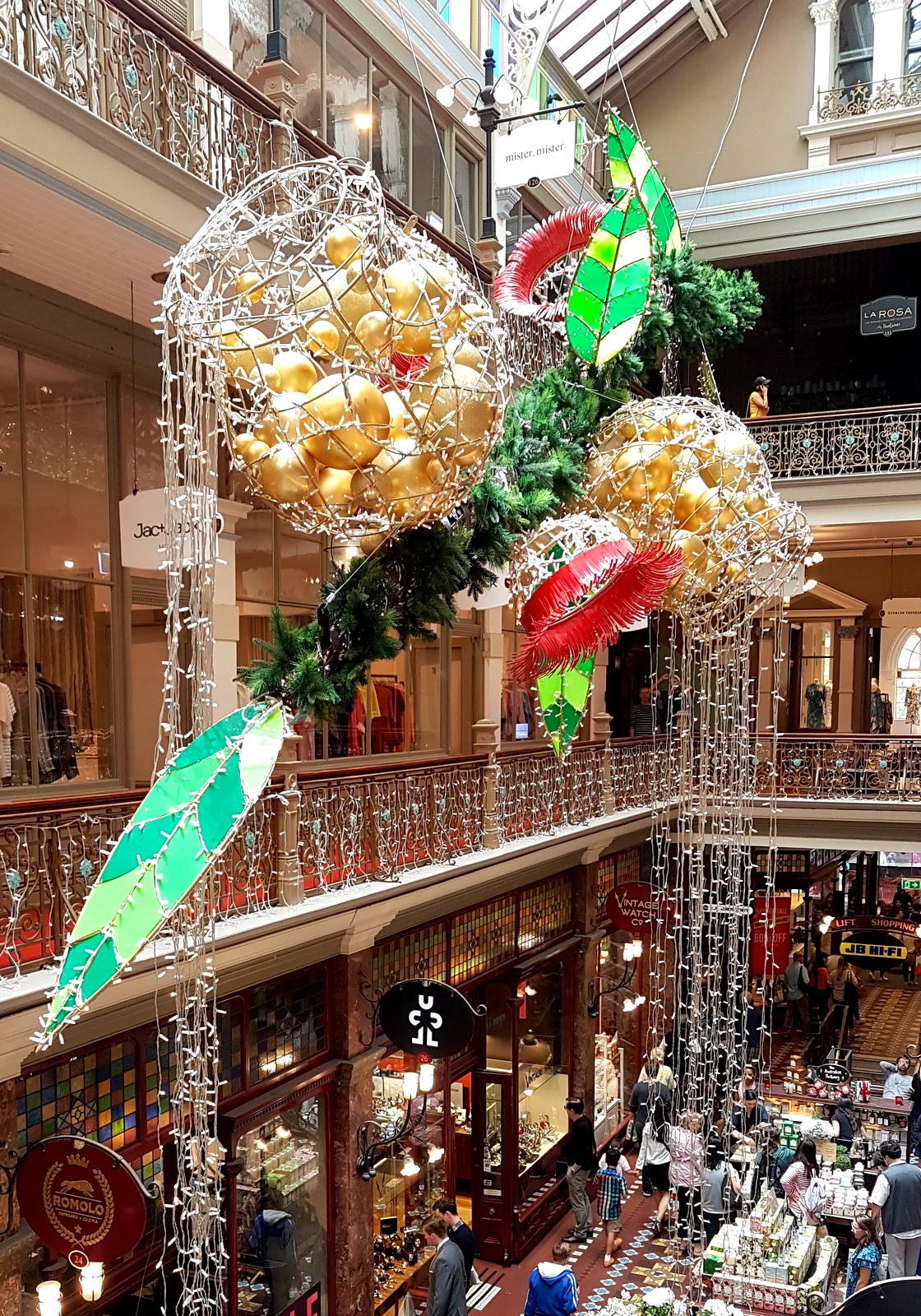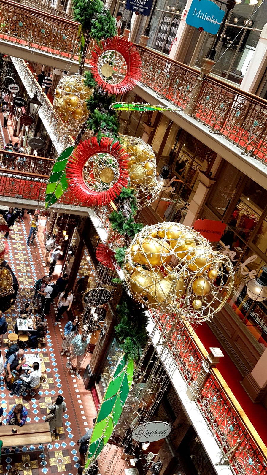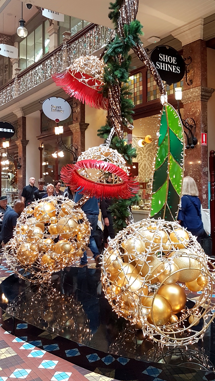Pas de sapin pour Noel, en tous cas rien de bien significatif mais une réalisation très originale de gigantesques branches d’eucalyptus en fleurs composée de décorations de Noel. Chaque branche a une hauteur impressionnante de 3,50m sur 9,80m et s’étend verticalement sur plusieurs niveaux de l’arcade. Au rez-de-chaussée, on trouve une énorme gousse de noix de gomme de 4 m de haut. Ces sculptures, éclairées de 27 500 lumières de Noel, célèbrent l’histoire australienne en s’inspirant de la flore indigène en mêlant art et modernité… Etonnant, plutôt anachronique mais tellement beau !!!