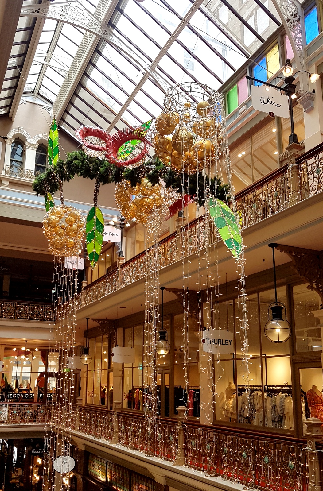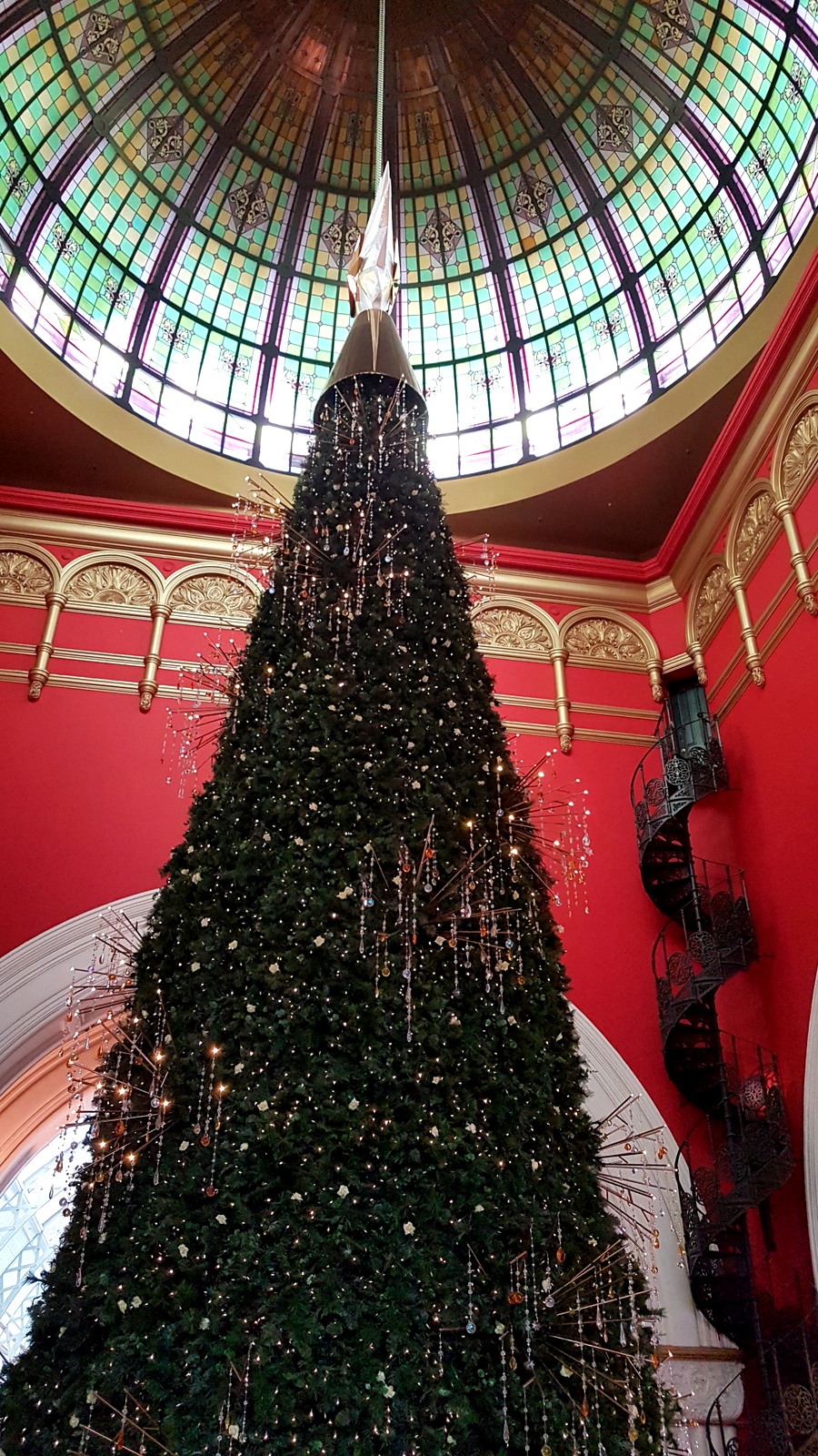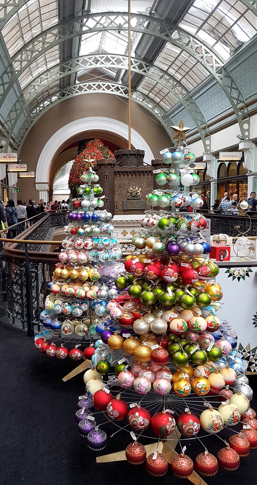 Pas de sapin pour Noel, en tous cas rien de bien significatif mais une réalisation très originale de gigantesques branches d’eucalyptus en fleurs composée de décorations de Noel. Chaque branche a une hauteur impressionnante de 3,50m sur 9,80m et s’étend verticalement sur plusieurs niveaux de l’arcade. Au rez-de-chaussée, on trouve une énorme gousse de noix de gomme de 4 m de haut. Ces sculptures, éclairées de 27 500 lumières de Noel, célèbrent l’histoire australienne en s’inspirant de la flore indigène en mêlant art et modernité… Etonnant, plutôt anachronique mais tellement beau !!!