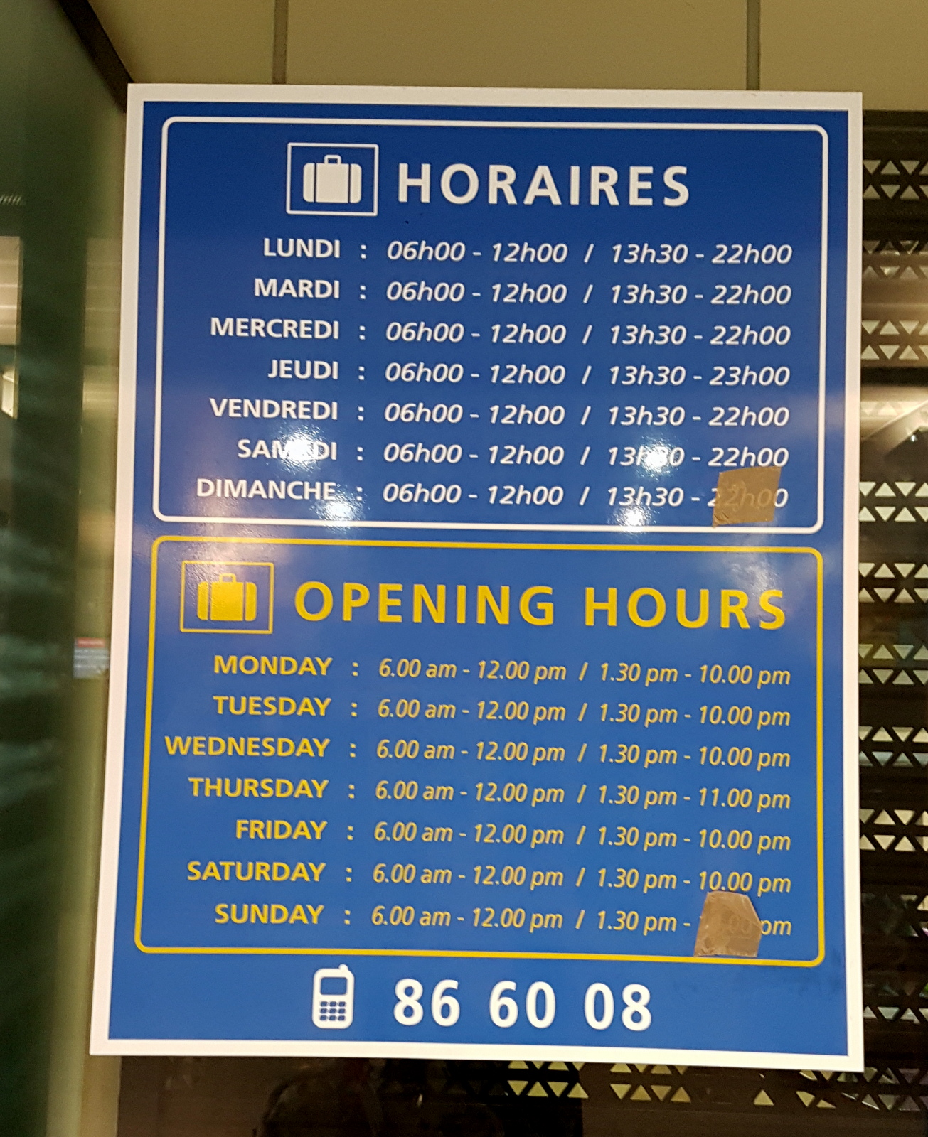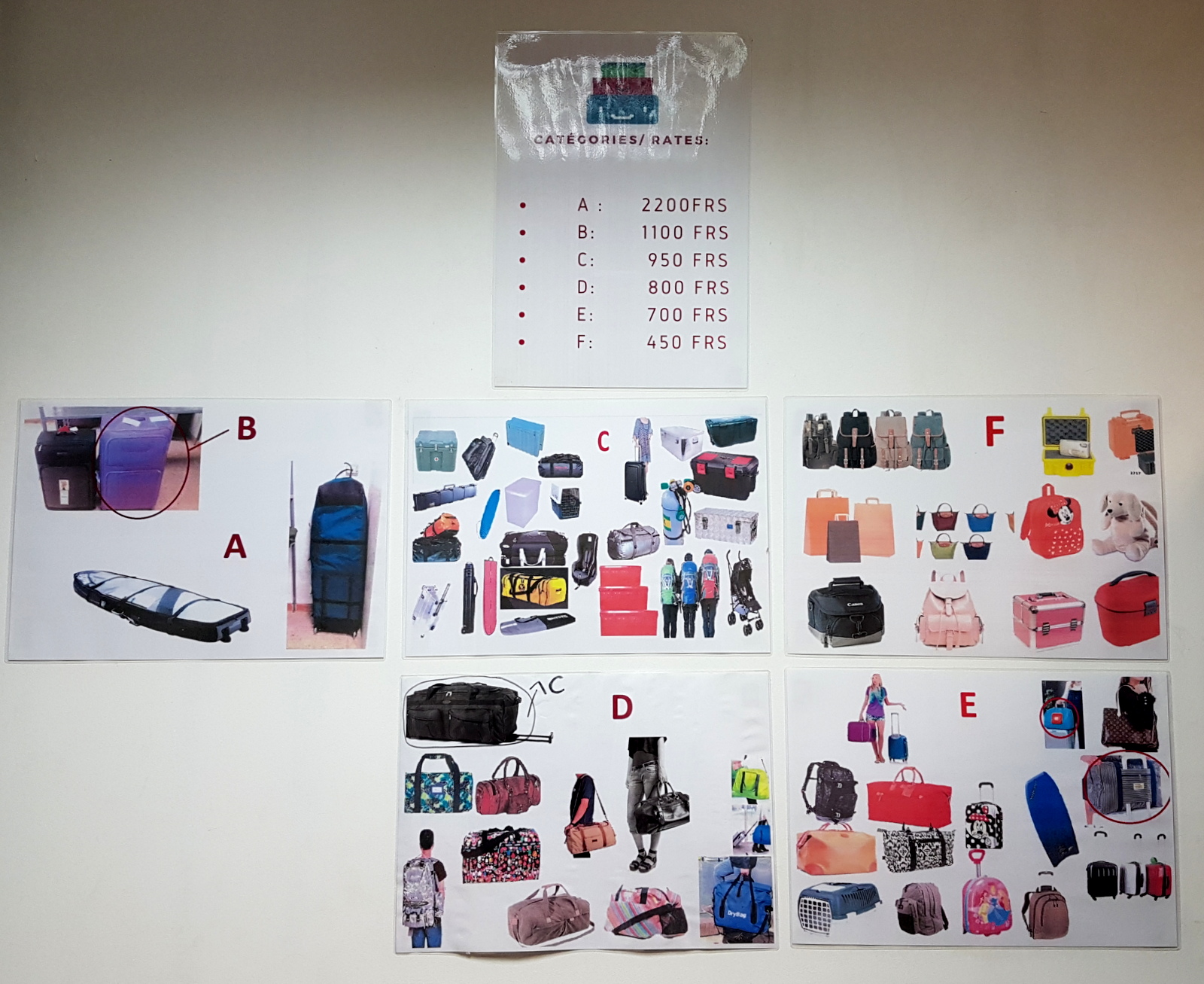 Bon à savoir: quand on visite la Polynésie durant l’hiver français et qu’on ne veut pas s’ embarrasser de ses vêtements chauds du retour dont on n’a absolument pas besoin ou que l’on a un équipement sportif dont on ne se servira que plus tard dans le séjour, on peut disposer d’une consigne à bagages à l’aéroport de Faa’a. Elle se trouve en zone publique du terminal international et est ouverte du lundi au dimanche de 06h00 à 12h00 et de 13h30 à 22h00 sauf le jeudi de 06h00 à 12h00 et de 13h30 à 23h00. Le tarif est forfaitaire par tranche de 24h de 450 à 2700 CFP en fonction de la taille du bagage (voir photo ci-dessous). On peut régler en carte de crédit.