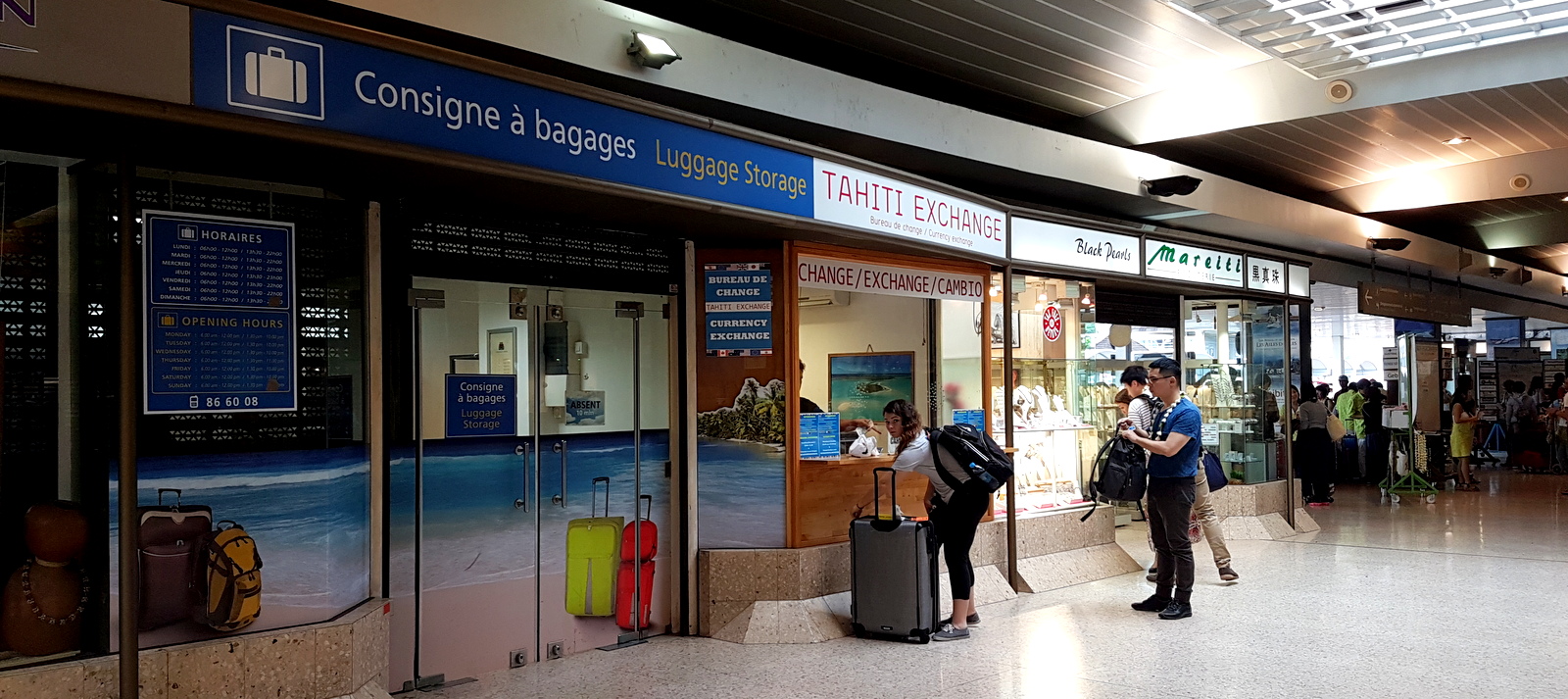 Vous ne pourrez pas obtenir des francs pacifiques en France avant de partir mais vous pourrez changer des euros dès votre arrivée à l’aéroport. Un bureau de change est ouvert du lundi au vendredi de 8h00 à 11h30 et 3 heures avant chaque départ international. Vous ne pourrez changer que 500€ maximum par personne et vous devrez vous acquitter d’une commission de 700 CFP (un peu moins de 6€) par transaction. Il vaut mieux donc changer le maximum et y aller à plusieurs si vous avez besoin de plus d’espèces.