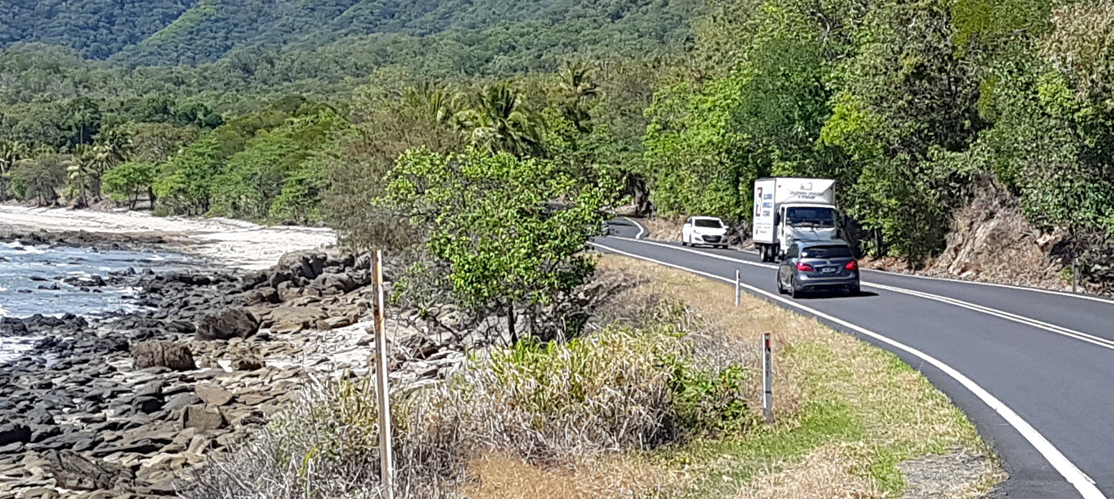 En fait, cette route fait 140 kms (de Cairns à Cape Tribulation) mais ce sont surtout les 30 kms entre Palm Cove et Oak Beach qui sont vraiment spectaculaires car la route longe la mer avec ses différences nuances de bleu et ses magnifiques plages de sable doré !!!