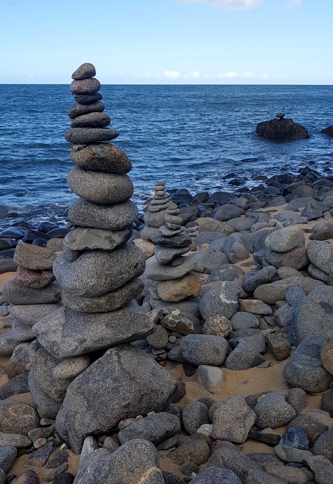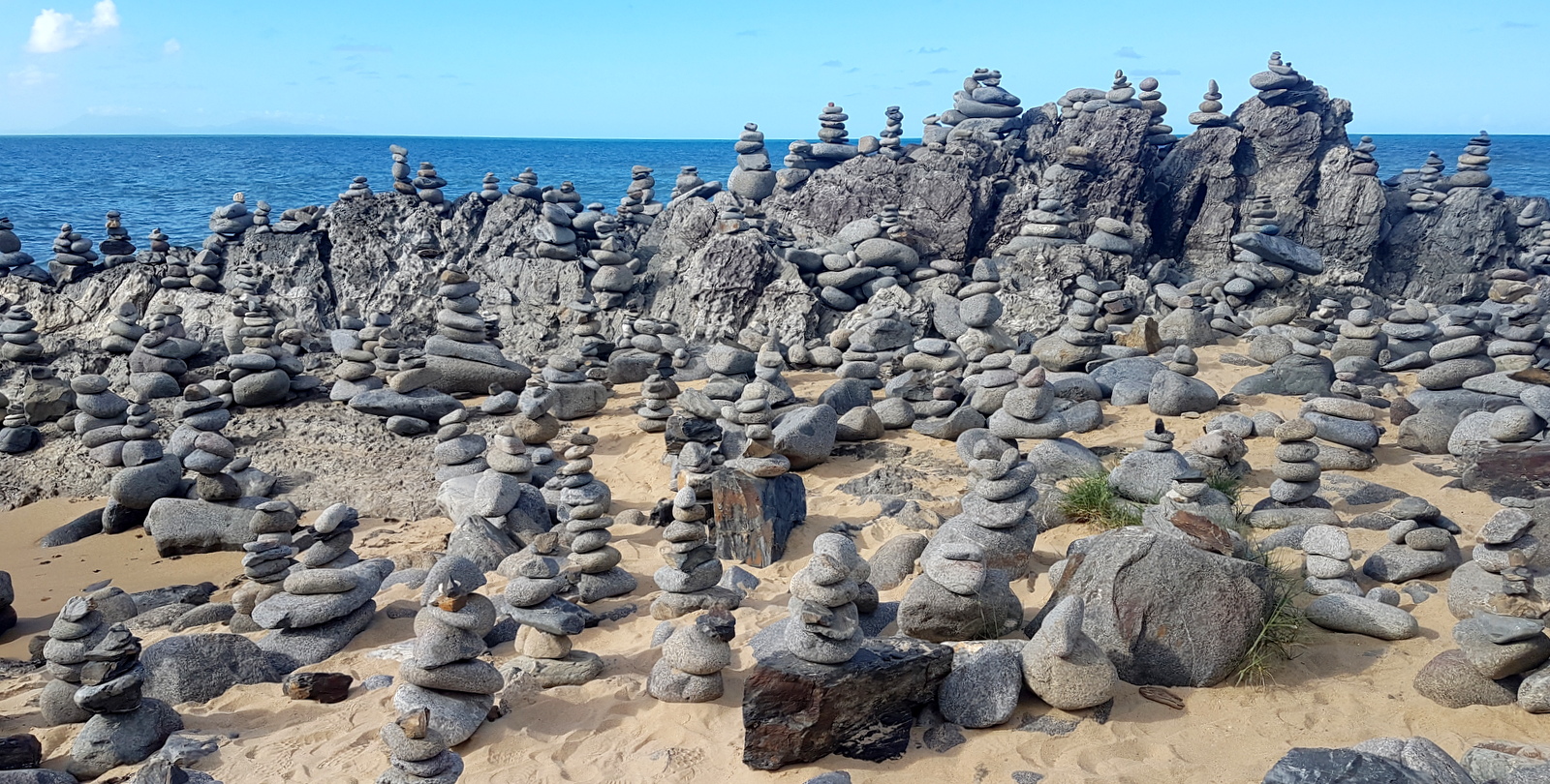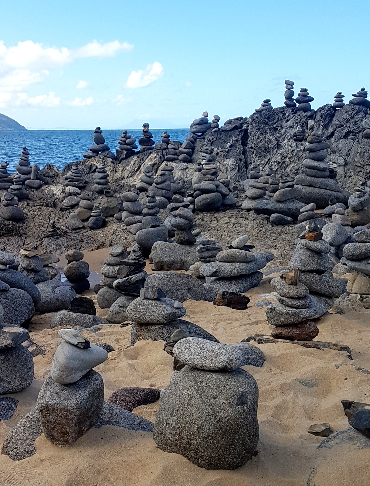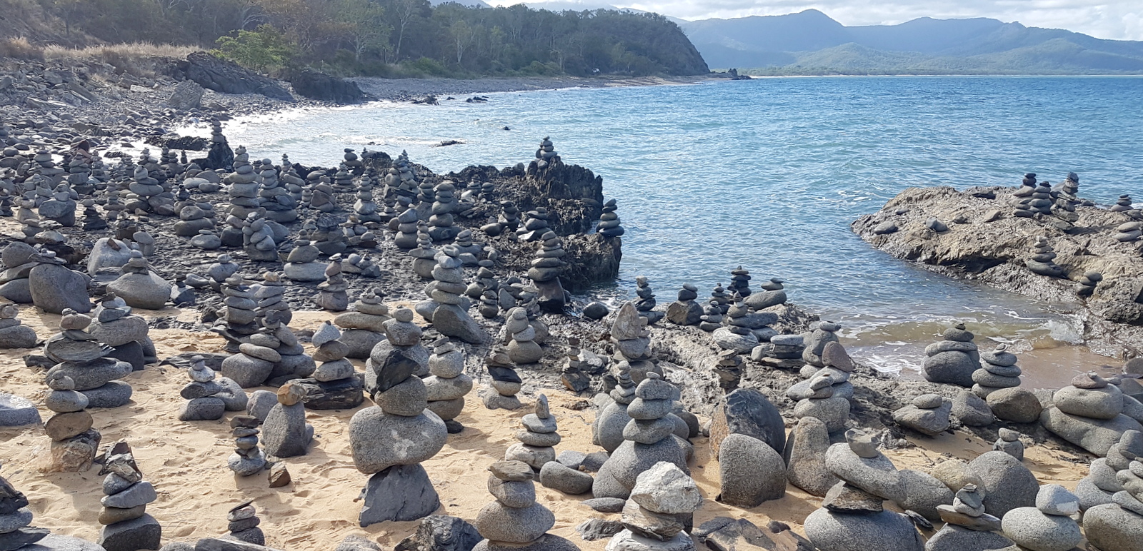 Juste après Palm Cove et environ 300m après que la route ne se sépare en patte d’oie, on fait un premier arrêt sur une plage où il y a de nombreux galets empilés… Il parait que ça porte bonheur alors on en construit un en faisant le vœu de faire un magnifique voyage et… ça marche !!!