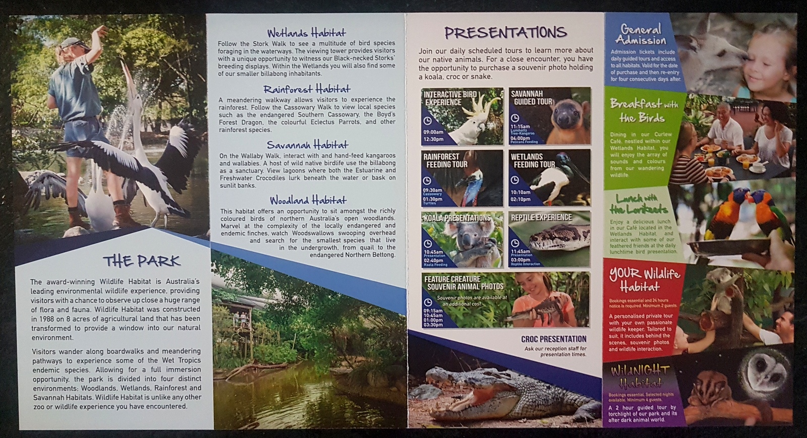 On a pris un billet combiné pour ce parc et celui des crocodiles (Hartley’s) qu’on a croisé sur la route entre Cairns et Port Douglas qu’on a l’intention de visiter sur le retour. Le total est de 67,50$ au lieu de 75$ avec une entrée libre et permanente au Wildlife Habitat pendant 5 jours!!!