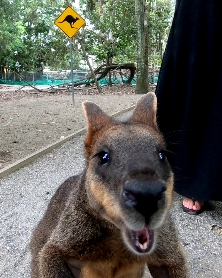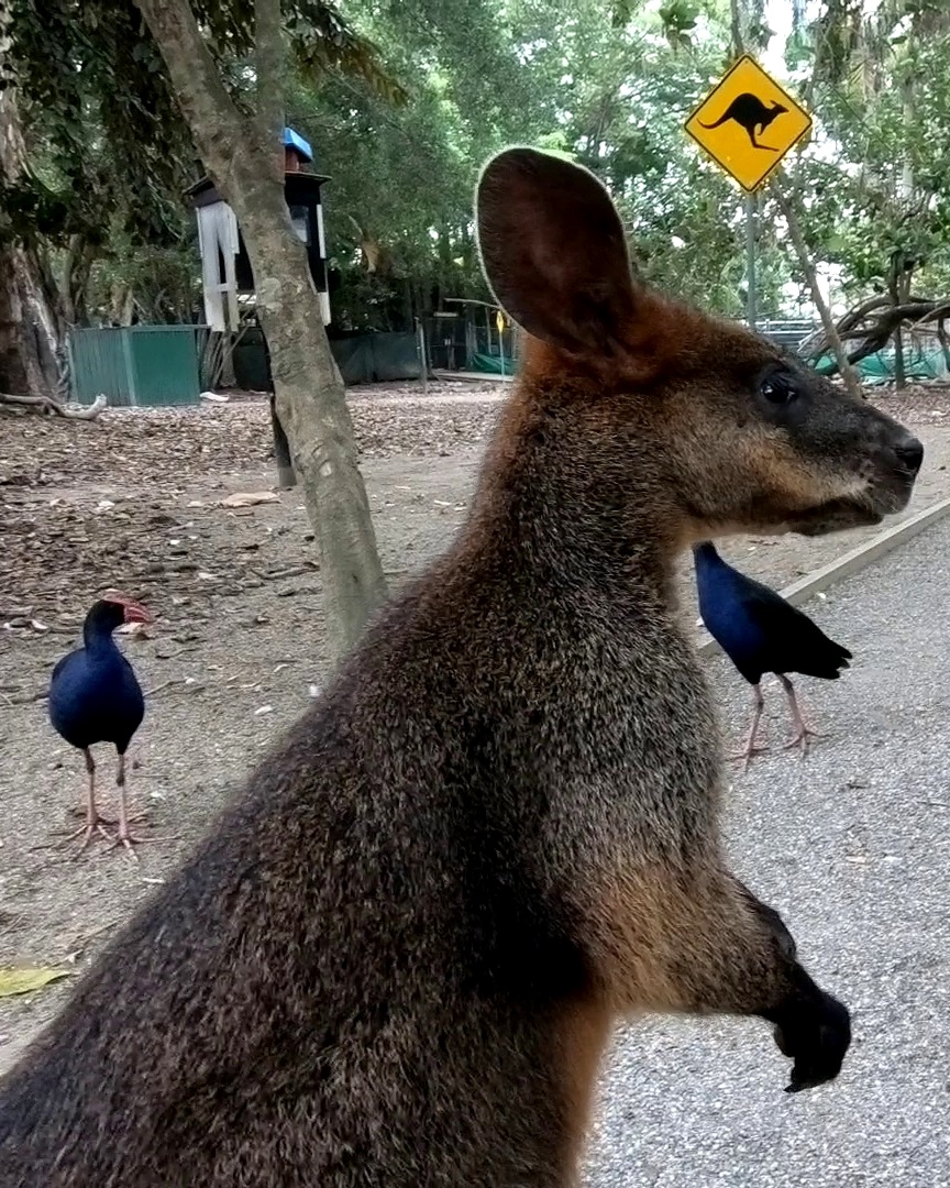 En sortant de Cairns, on croise très vite une pancarte nous alertant du passage de kangourous dans les environs et en effet, on voit une grosse famille de marsupiaux dans un champ en front de mer. On apprendra plus tard que les pauvres se sont retrouvés coincés là entre 2 sites de construction et la route et qu’ils sont voués à mourir de faim si on ne les délocalise pas, ce que la mairie tarde à faire mais ce ne sont que des kangourous malheureusement !!!