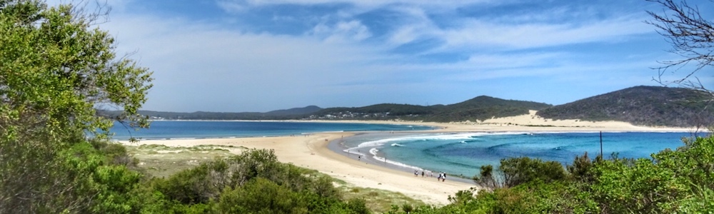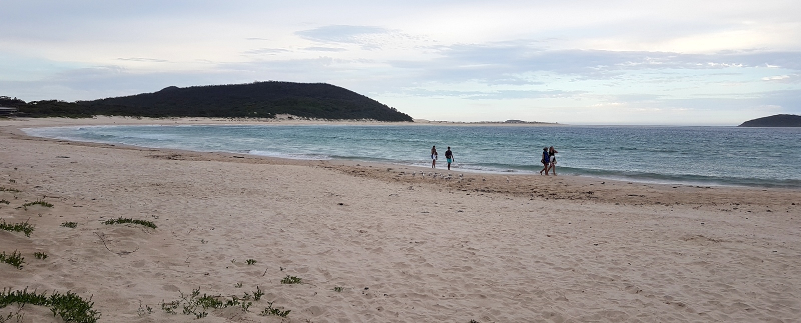 Fingal Bay, c’est d’abord une plage d’une courbe presque parfaite, très populaire d’où part, au nord, une bande de sable, le Fingal Spit qui rejoint une île, Shark Island.