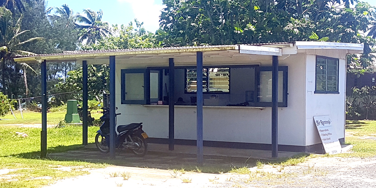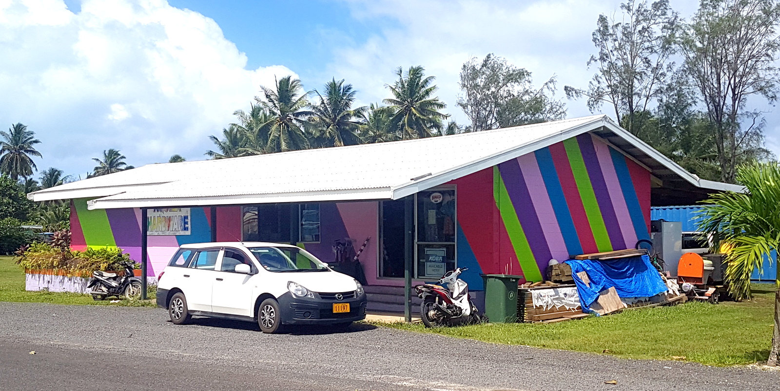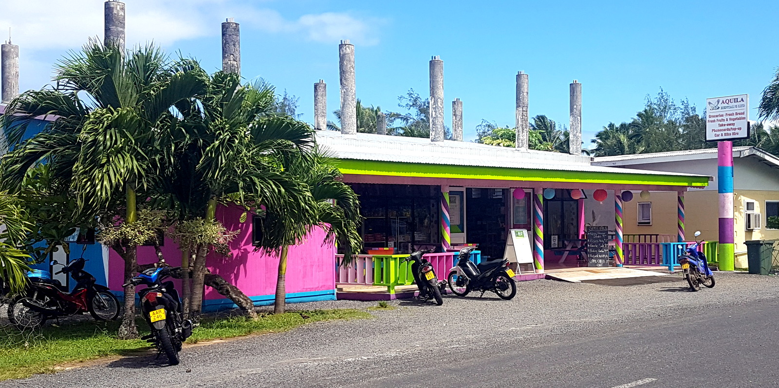 Ensuite, il y a 2 boutiques (une épicerie générale et un magasin de bricolage) et une station essence AQUILA (la 3 ème sur Aitutaki) facilement reconnaissables avec leurs façades colorées.