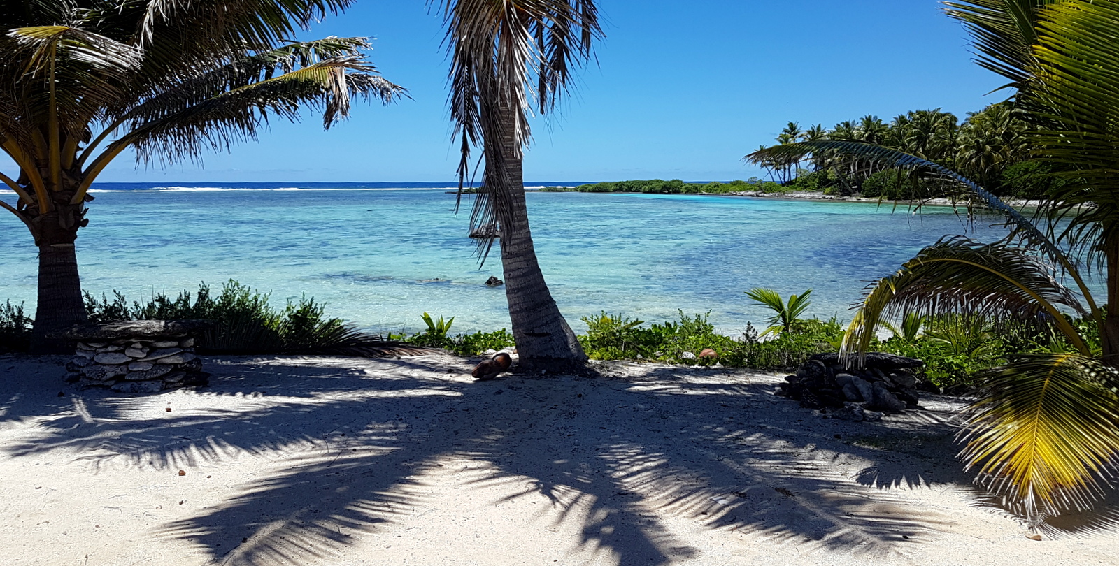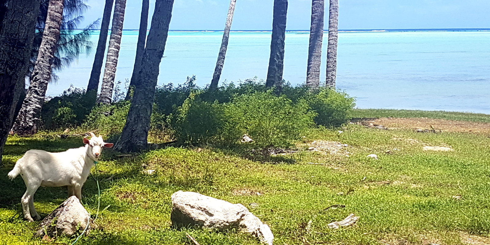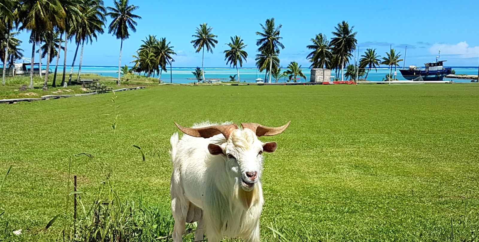 Elle ressemble beaucoup aux îles de la Polynésie: la végétation, la population, le climat (un tout petit peu plus chaud quand même, 32°C en février!) mais en plus propre, plus ordonné, à l’anglo-saxonne !!! Il n’y a pas de clôtures autour des maisons mais de grandes pelouses parfaitement tondues. Les routes sont belles et bien entretenues. Et surtout, aucun chien errant car ils sont interdits sur l’île !!! En se renseignant, on apprend qu’il y a longtemps (au moins 50 ans puisque plus personne ne se souvient de quand ça date exactement…), la fille d’un chef de l’île s’est fait cruellement mordre la main (au point d’être arrachée disent même certains) et qu’en représailles, le dit chef a fait euthanasier tous les chiens de l’île et interdire d’en importer, interdiction toujours en vigueur… Aitutaki est donc devenu le paradis des chats et des chèvres !!! La version officielle est un peu différente: les chiens auraient été décimés dans le début des années 1900 car accusés d’être les porteurs de la peste qui a sévit sur Aitutaki à cette période…