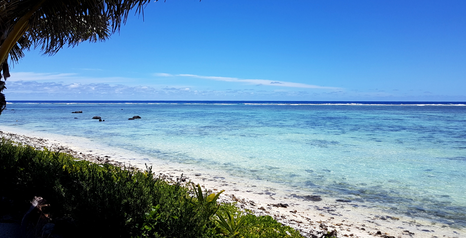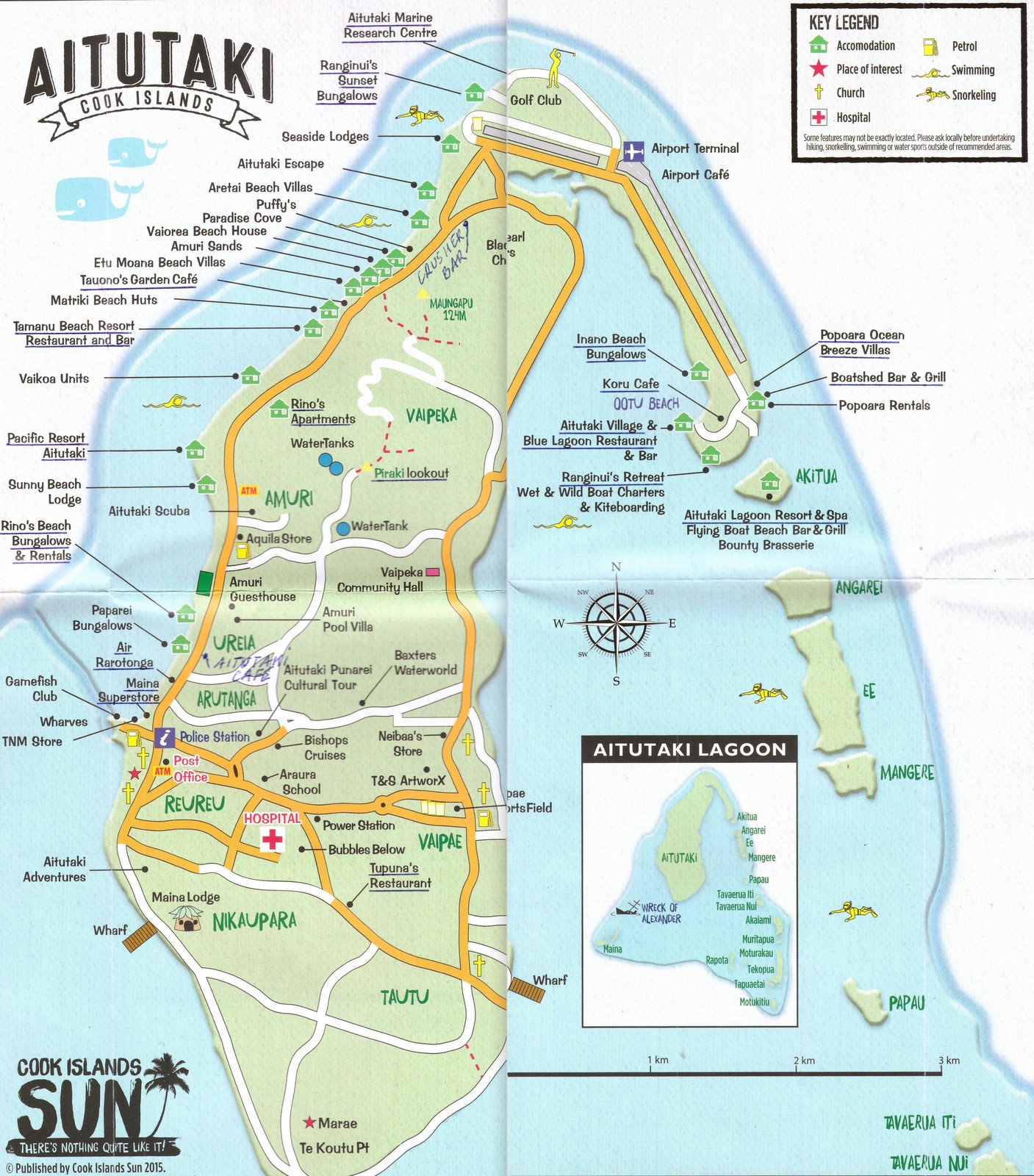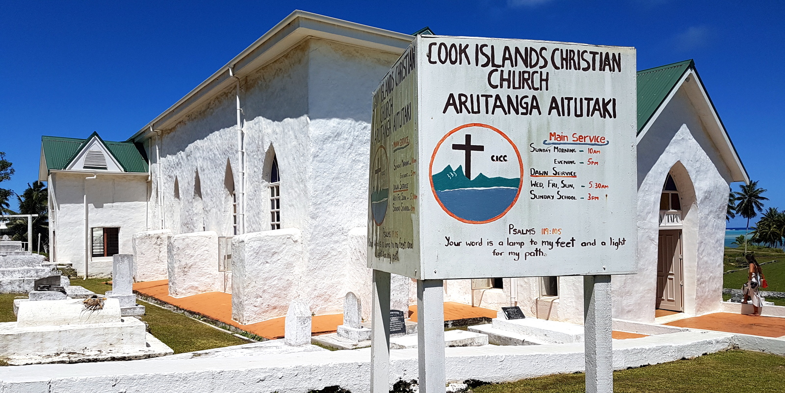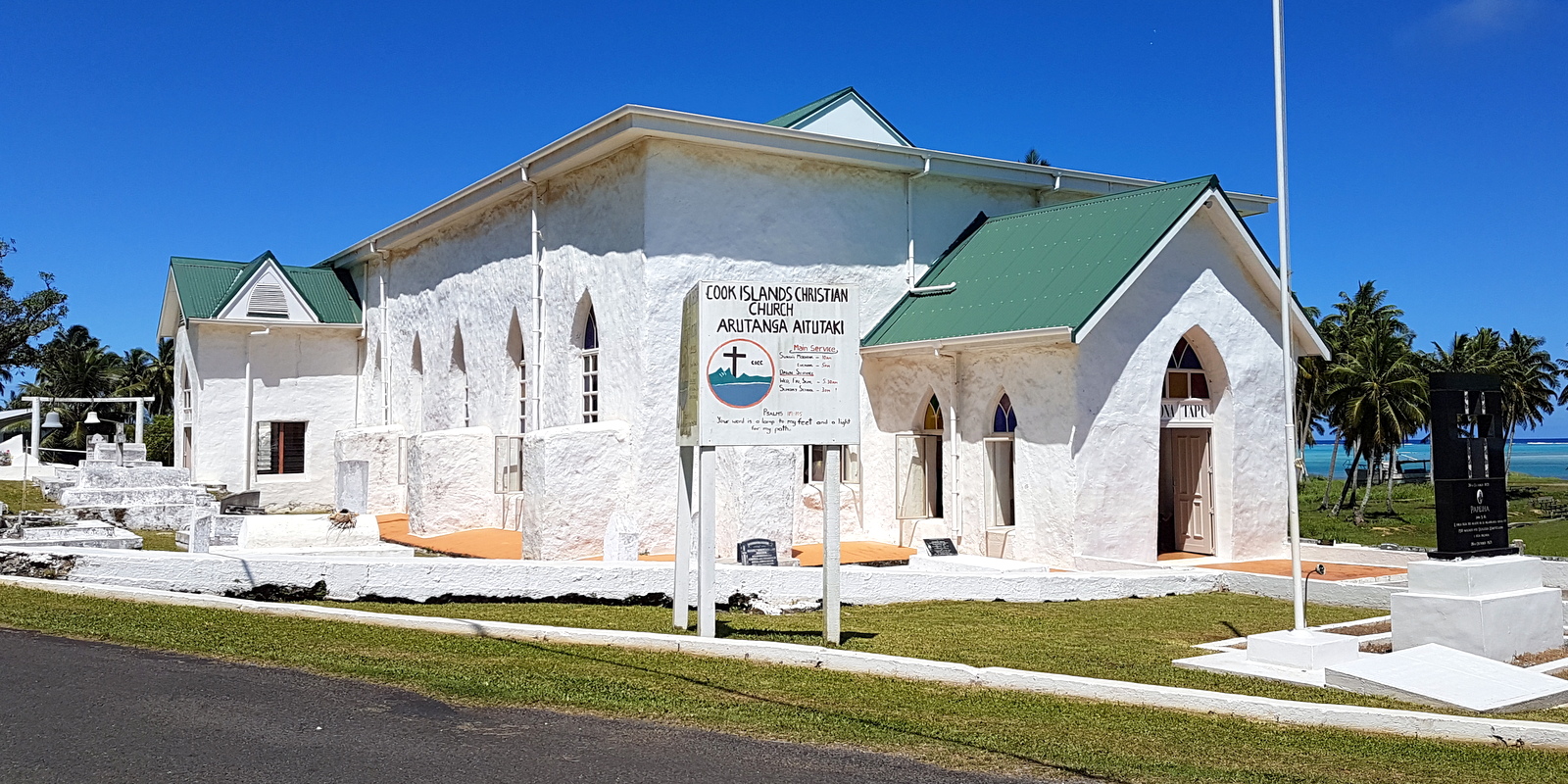 La route bordée de flamboyants en fleurs longe le lagon et des pelouse où flânent des chèvres. Très vite sur la gauche, on trouve le AITUTAKI CAFE (voir article restaurants) puis à droite le bureau d’Air Rarotonga. Juste après le MAINA SUPERSTORE (on peut y acheter à peu près de tout), c’est le « centre ville » !!! Un office de tourisme (toujours fermé), 2 banques où on peut faire du change, une station service (c’est là que l’on trouve le plus de fruits en ville bizarrement!), le marché (qui ne vend rien ou si peu…), un snack qui ne désemplit pas (visiblement le MacDo local) et une magnifique église toute blanche où de magnifiques messes chantées sont données le dimanche matin.