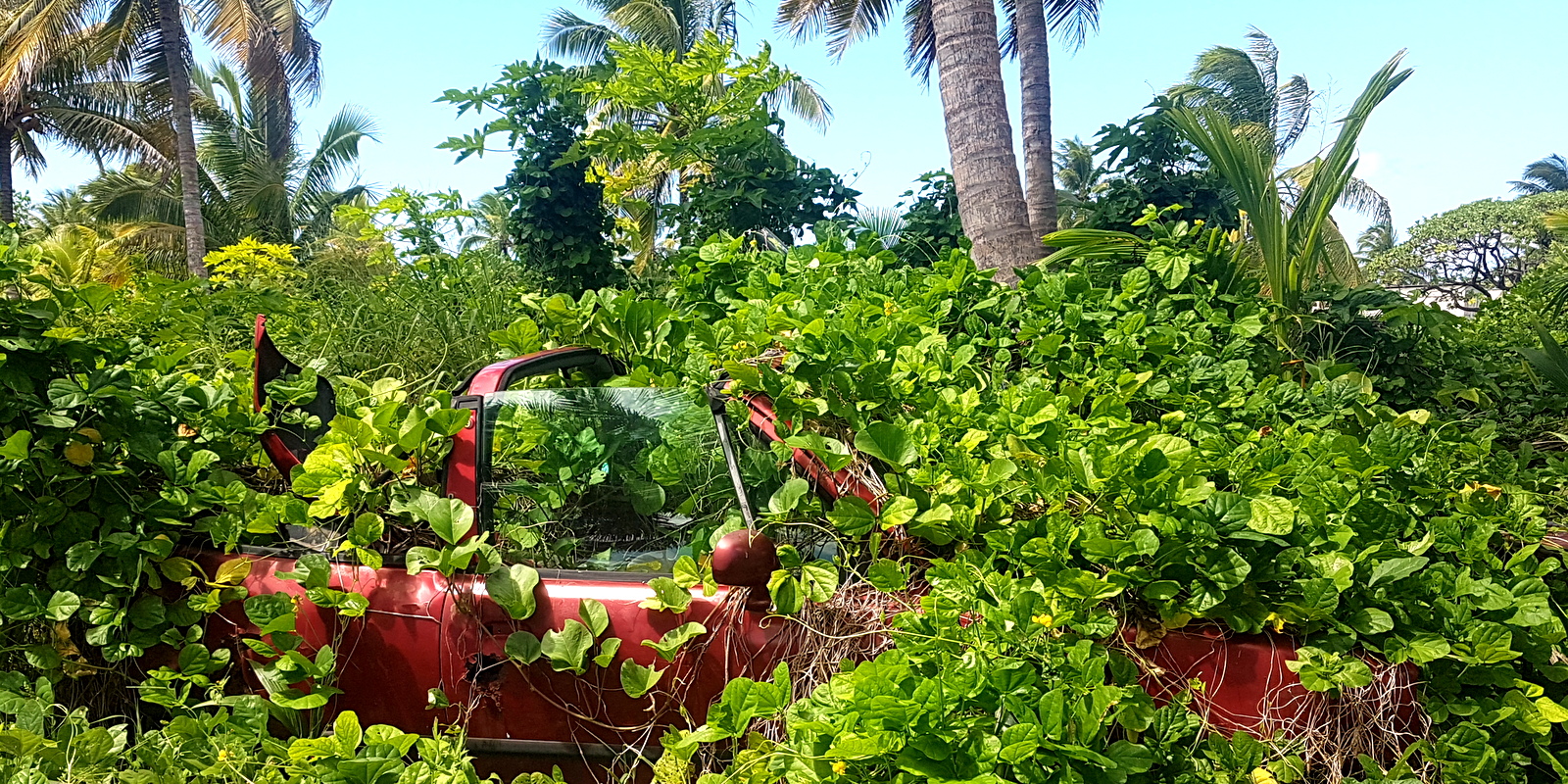 On en profite pour aller visiter la presqu’île où nous séjournerons dès le lendemain. C’est à l’extrémité de celle-ci qu’on a la vue la plus incroyable sur le lagon… Encore plus qu’ailleurs, le temps semble s’être arrêté, un hamac en bord de mer invite à la sieste, des voitures sont entièrement recouvertes de végétation et ce lagon si bleu… Nous avons hâte d’y déménager car c’est de loin, le plus beau coin de l’île…