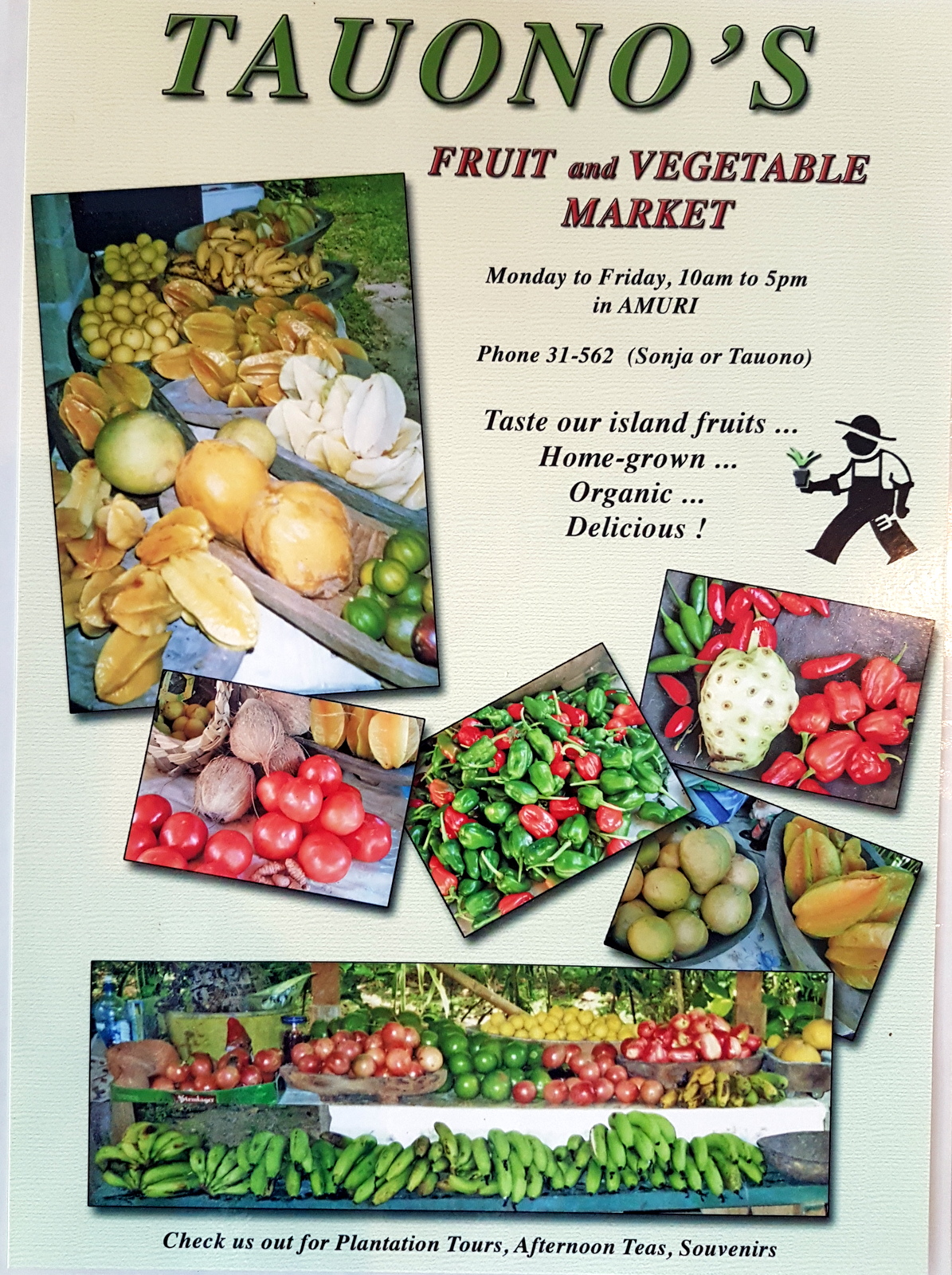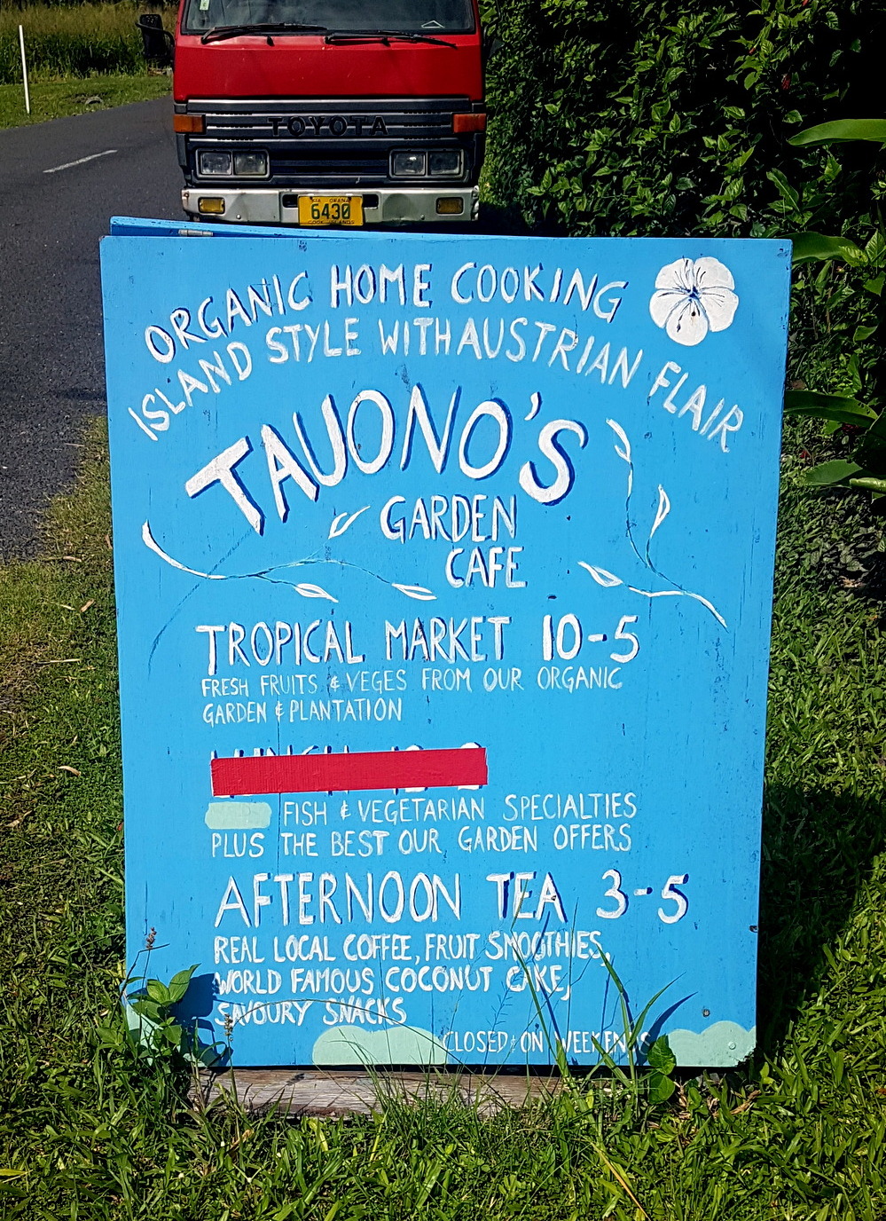 Un peu plus loin sur la droite, le TAUONO’S GARDEN CAFE où si vous avez la chance de vous y trouver entre 15 et 17h, vous pourrez prendre un « afternoon tea » accompagné de fruits frais et gâteaux faits maison. Il semblerait qu’on puisse aussi visiter les plantations (mais pas quand on y était). On peut y acheter toutes sortes de fruits, c’est visiblement l’endroit de l’île où il y a le plus de choix en quantité…