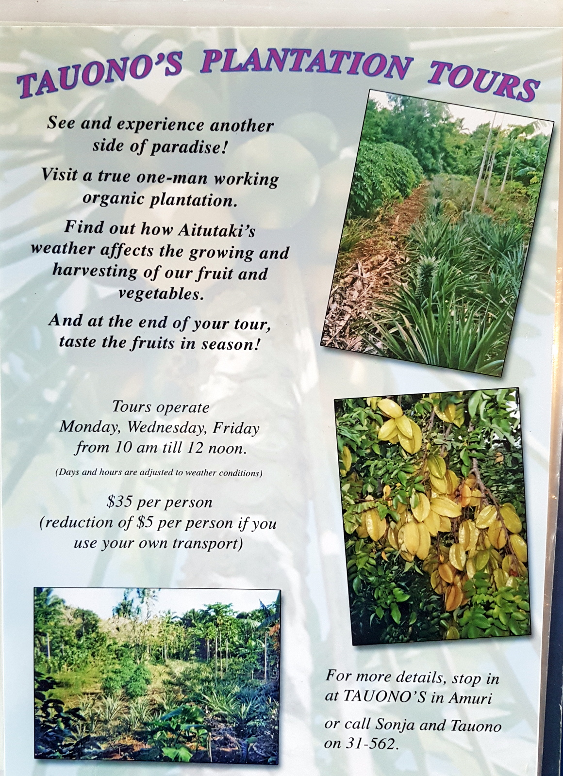 Depuis Rarontonga, Air Rarontonga propose un package: le AITUTAKI DAYTOUR, qui inclut une journée sur l’île avec un tour sur le lagon: le VAKA CRUISE (voir le chapitre activités) et le vol aller-retour pour 493 NZ$ (environ 300€)/adulte, 246,50 NZ$ (environ 150€)/ enfant de 2 à 11 ans, gratuit pour les enfants de moins de 2 ans. Ce tour part tous les jours (sauf le dimanche) à 8h00 et revient à 17h30. Ca peut-être une bonne option quand on veut avoir un aperçu d’Aitutaki sans y séjourner…
