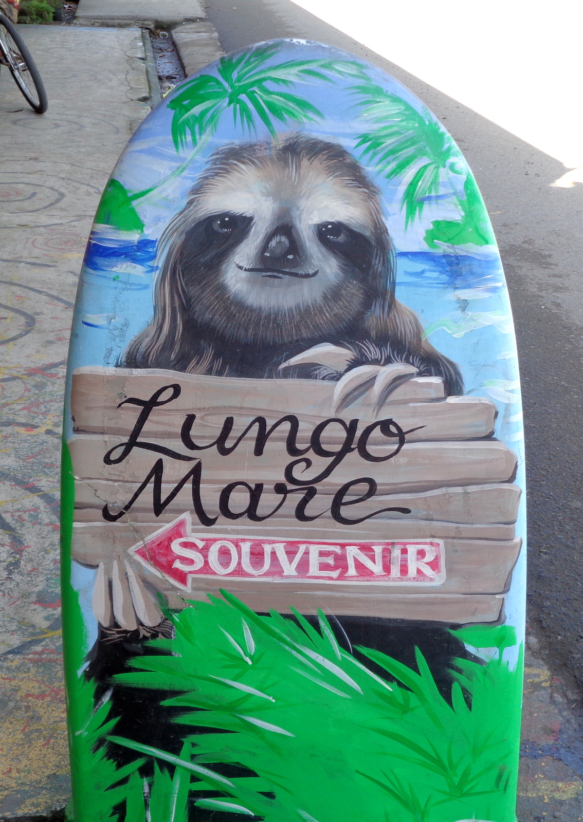 A peine la plage Cocles dépassée, nous croisons un paresseux qui essaie de traverser la route… Vu sa lenteur et la circulation, il n’y arrivera jamais entier si nous ne l’aidons pas. Nous bloquons donc la route avec nos vélos le temps qu’il passe de l’autre côté. Les automobilistes sont compréhensifs, ils descendent même de leur voiture pour voir la scène de plus près. En 10mns, il y a une dizaine de voitures arrêtées dans chaque sens mais le paresseux est sain et sauf et nous, on a tous gagné un point sur notre karma !!!…