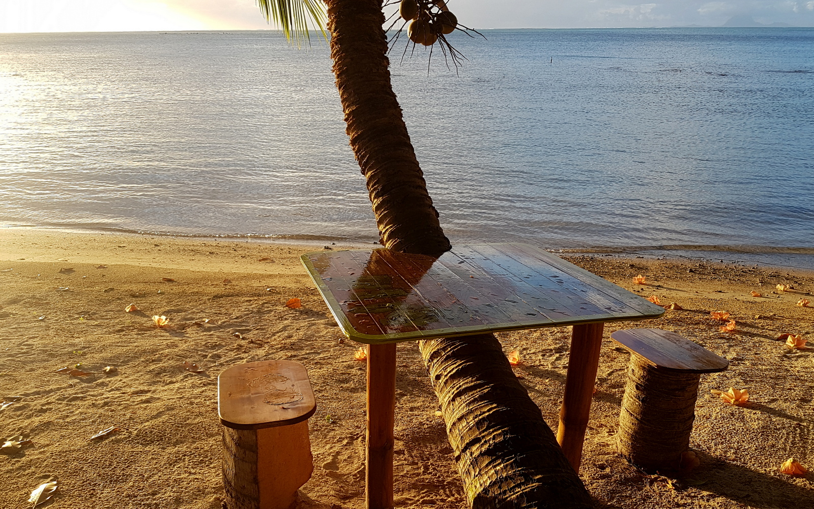 On peut y rester après la fermeture pour se baigner sur la plage devant. Pour la petite histoire, nous les avons appelés pour y manger le soir et on nous a réservé une table au Raiatea Lodge sans nous dire qu’il était fermé le soir. On y est donc allés uniquement pour contempler le coucher de soleil… et c’est bien dommage qu’il soit ne soit ouvert que le midi car c’est un super spot pour prendre un verre en admirant le ciel s’enflammer !!!