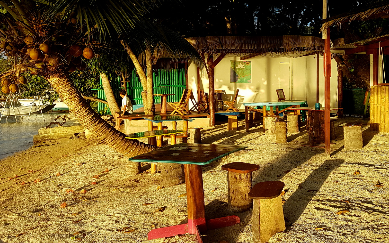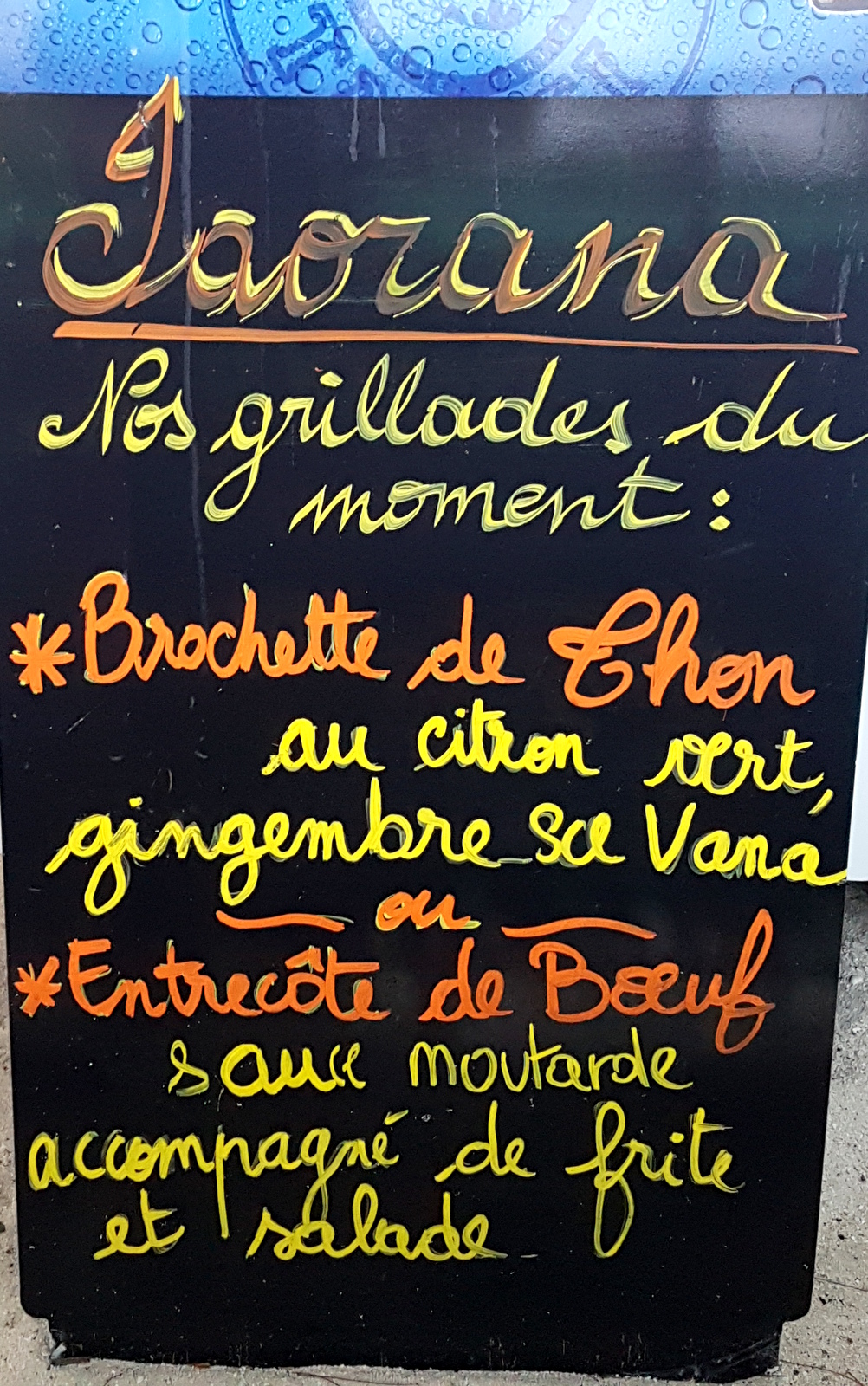 Le nouveau restaurant de plage du Raiatea Lodge récemment ouvert en juin 2017. Sur la plage en face de la passe de Miri-Miri, il propose un menu du jour avec un plat de poisson et un de viande avec des produits naturels (brochette de thon mariné au citron vert/gingembre et entrecôte de bœuf sauce moutarde le jour où nous y étions)…