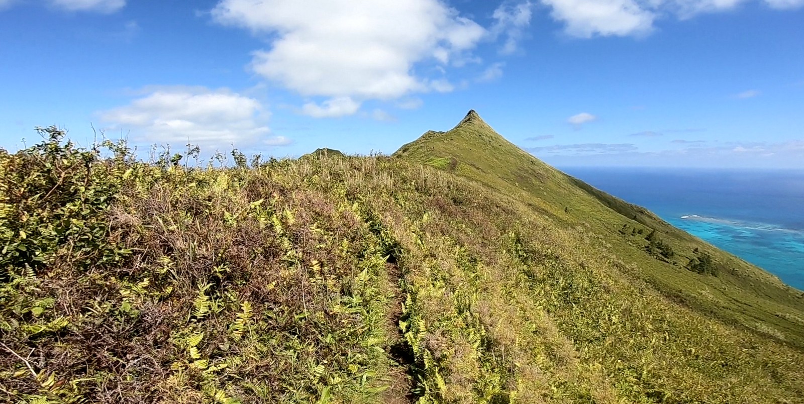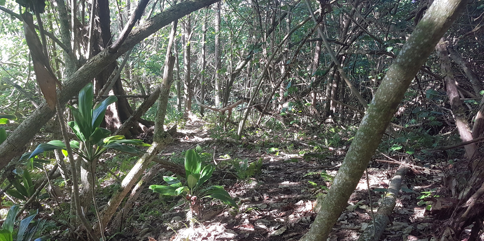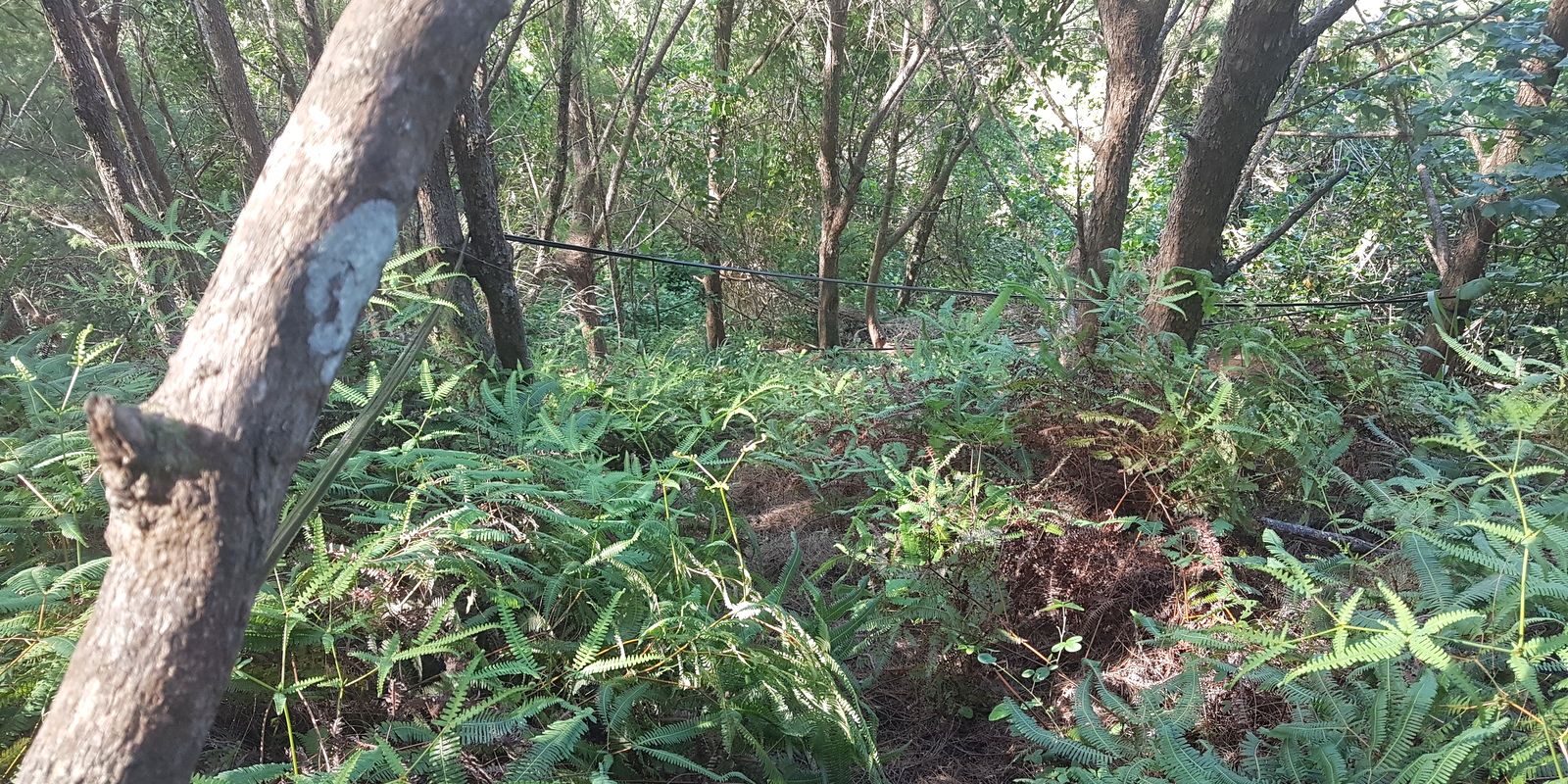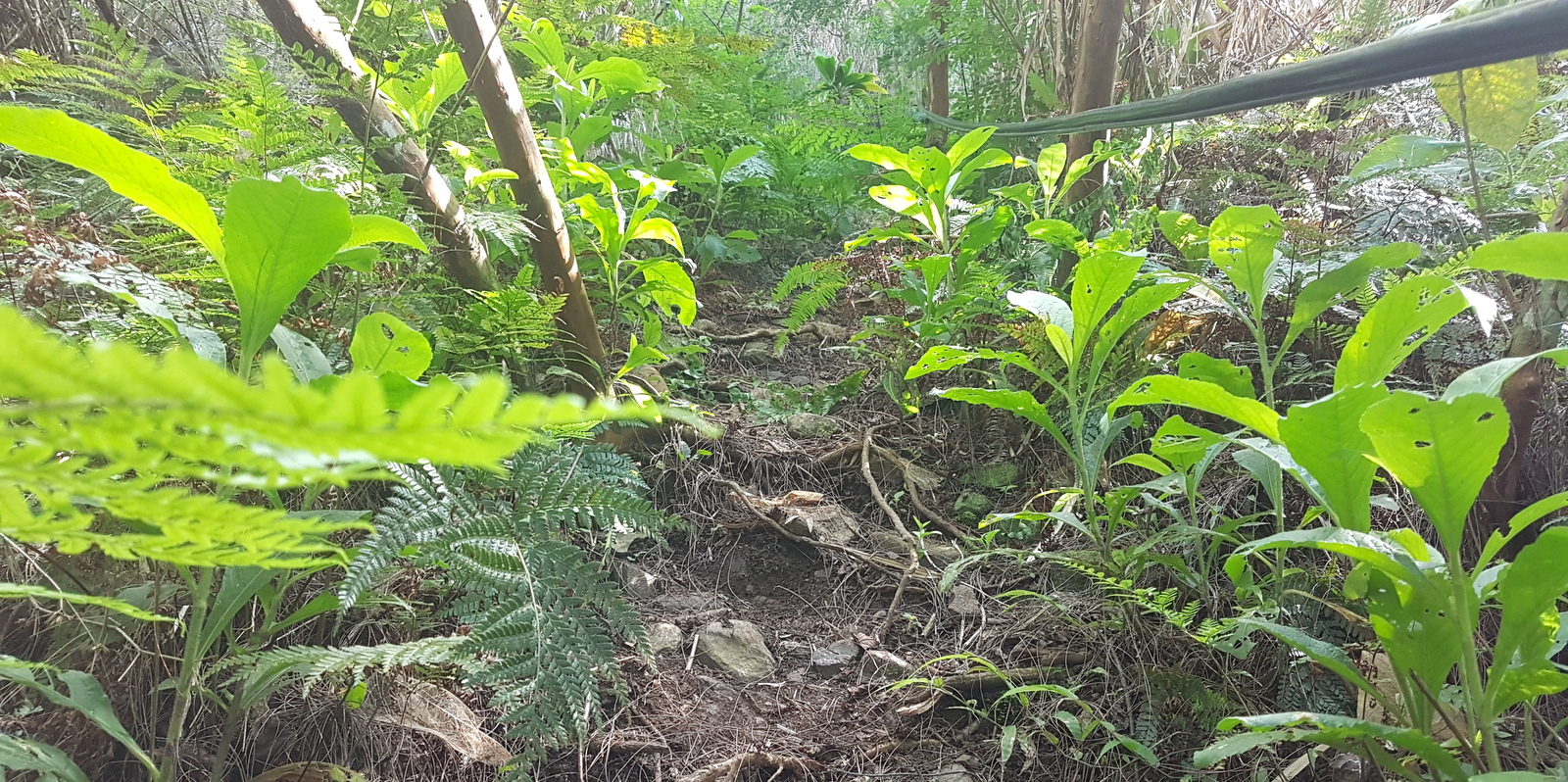 Heureusement, ce passage super physique ne dure qu’une centaine de mètres (qui paraissent très longues !!!) et puis on quitte la forêt pour continuer la montée dans les fougères pendant 20 bonnes minutes. On arrive enfin en haut de la crête mais ce n’est pas fini, il faut maintenant longer cette crête pendant une grosse demi-heure sur un chemin vaguement tracé au milieu des fougères, qui mesure entre 1 et 3 mètres de large pour atteindre le point culminant.