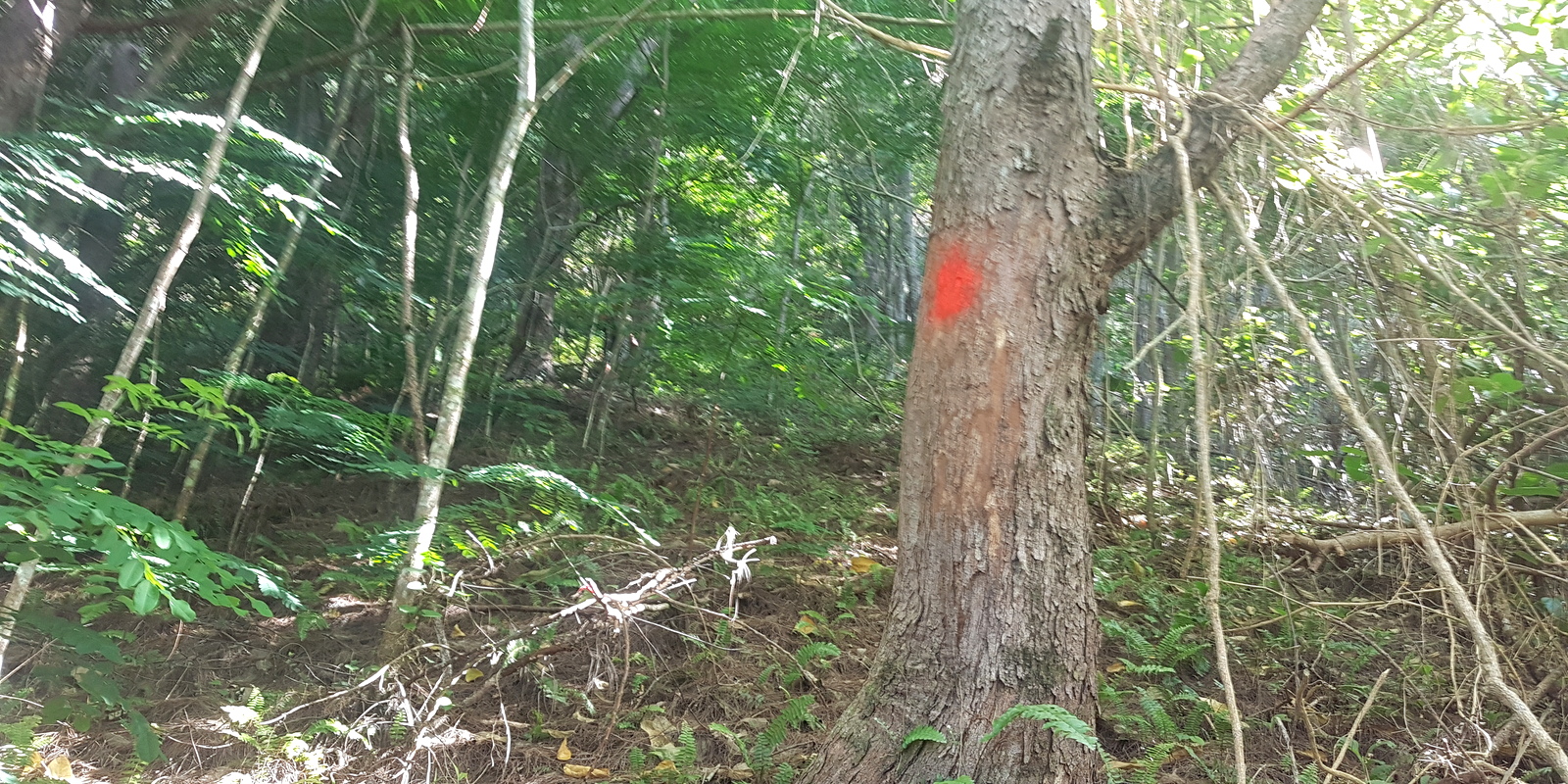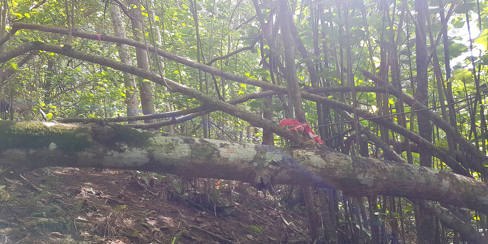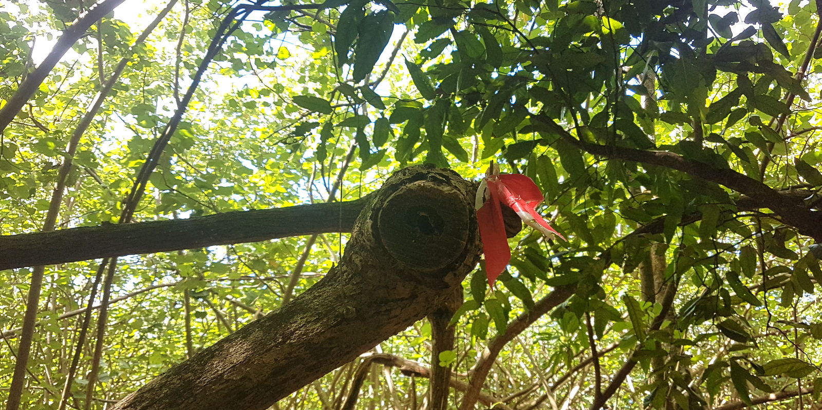 On se retrouve vite dans une forêt dense où le chemin est à peine visible. Par ci, par là, il y a des signes: points rouges peints, morceaux de tissus noués qui nous confirment qu’on est sur la bonne route.