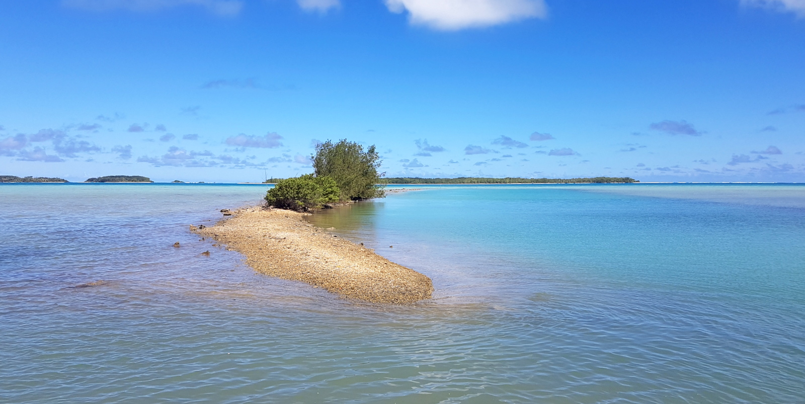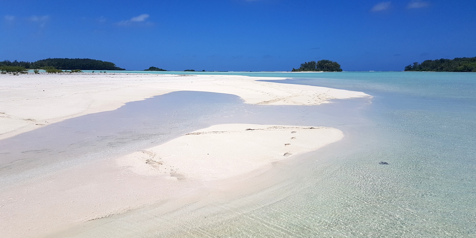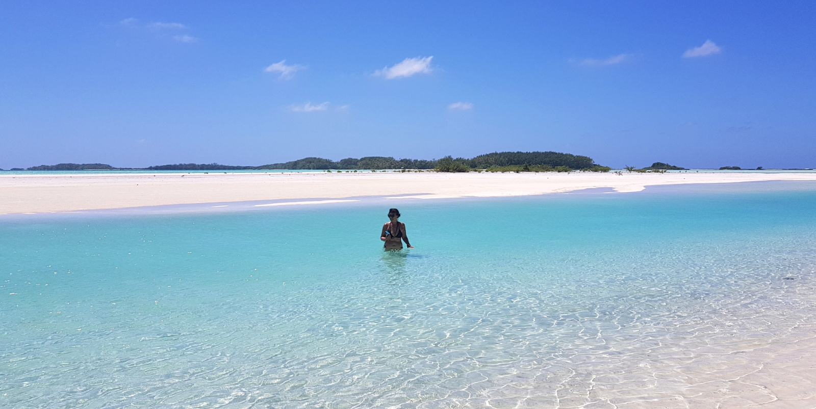 Il faut traverser le motu pour découvrir le fameux motu piscine. Après quelques minutes à chercher un sentier qu’on ne trouve pas (!), on arrive sur une plage où des bancs de sable blanc entourent un « bassin » d’un bleu magnifique !!!