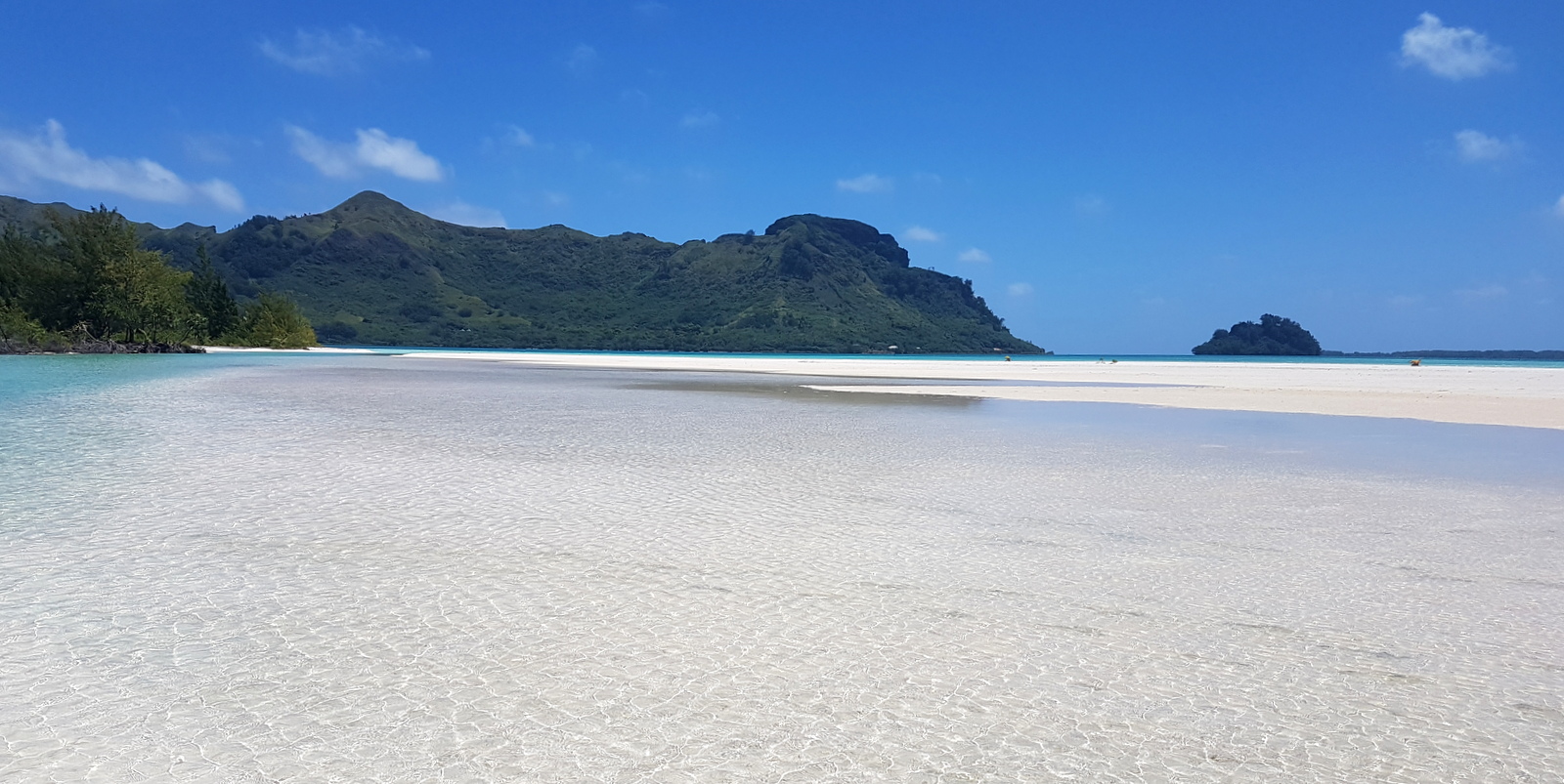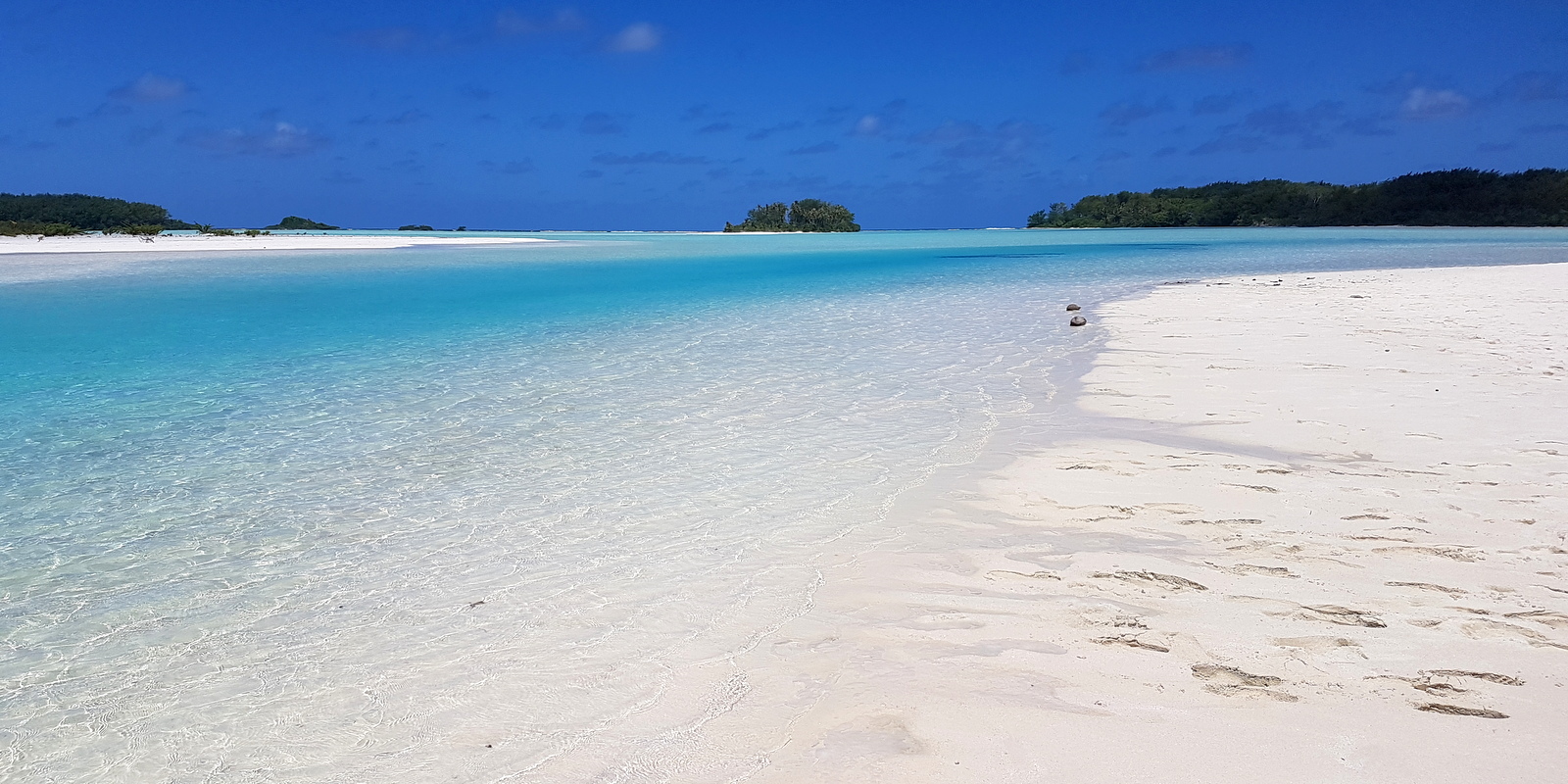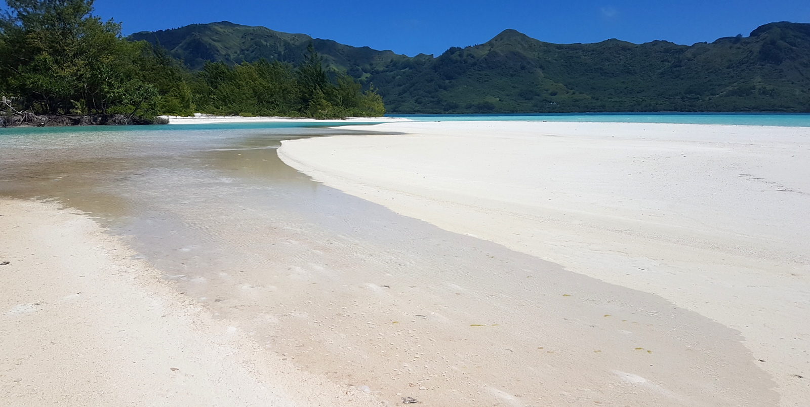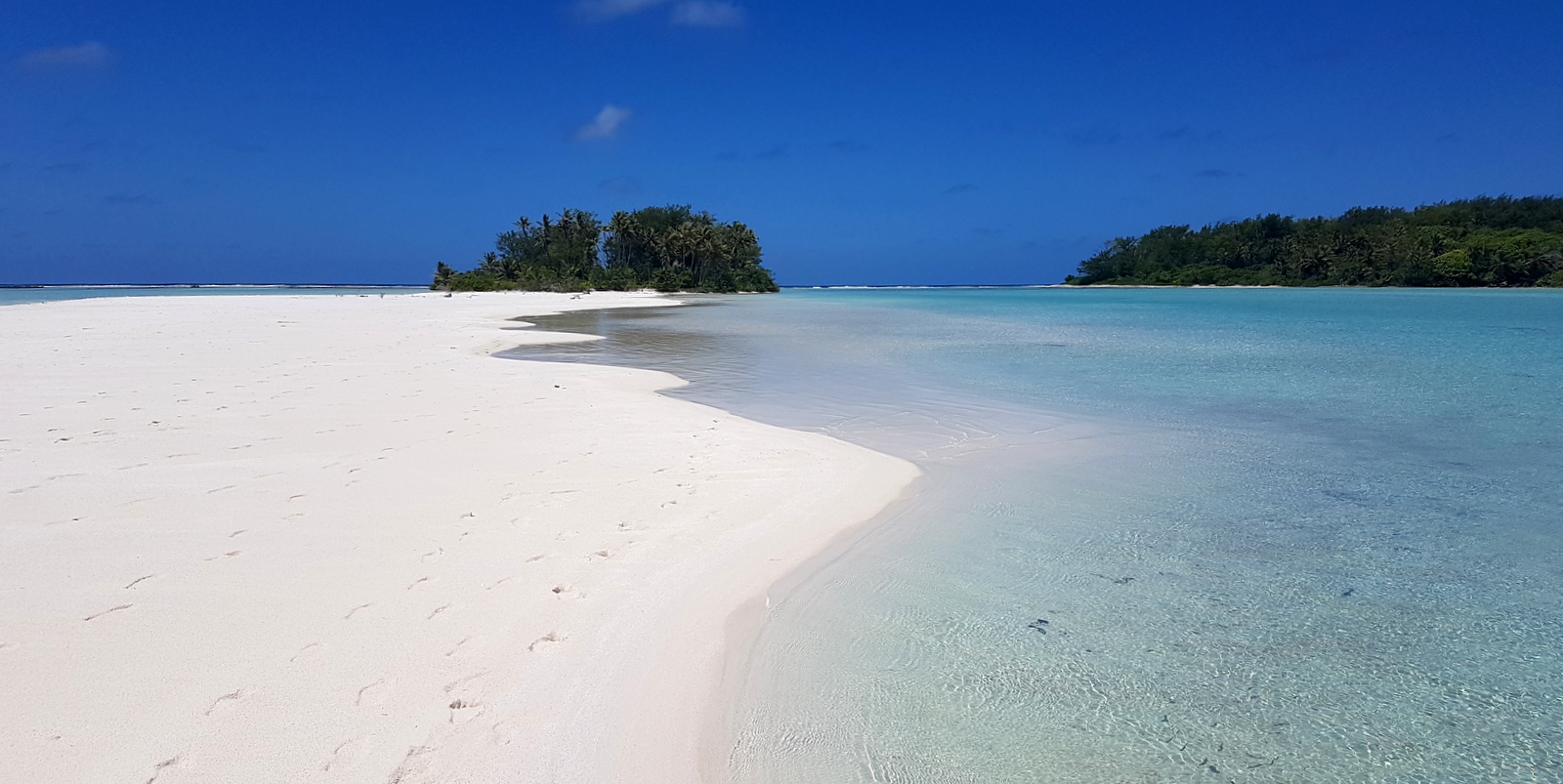 Il faut traverser le motu pour découvrir le fameux motu piscine. Après quelques minutes à chercher un sentier qu’on ne trouve pas (!), on arrive sur une plage où des bancs de sable blanc entourent un « bassin » d’un bleu magnifique !!!