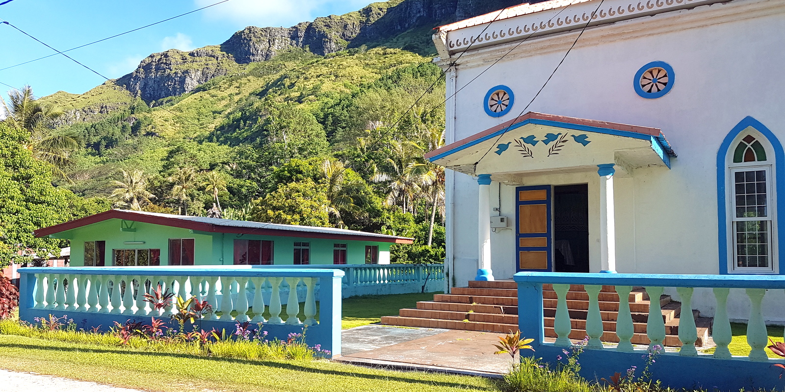 La pension Raivavae Tama est juste à côté d’une église qui est, en fait, un superbe temple protestant blanc et bleu, très photogénique : le Temple de Mahanatoa.