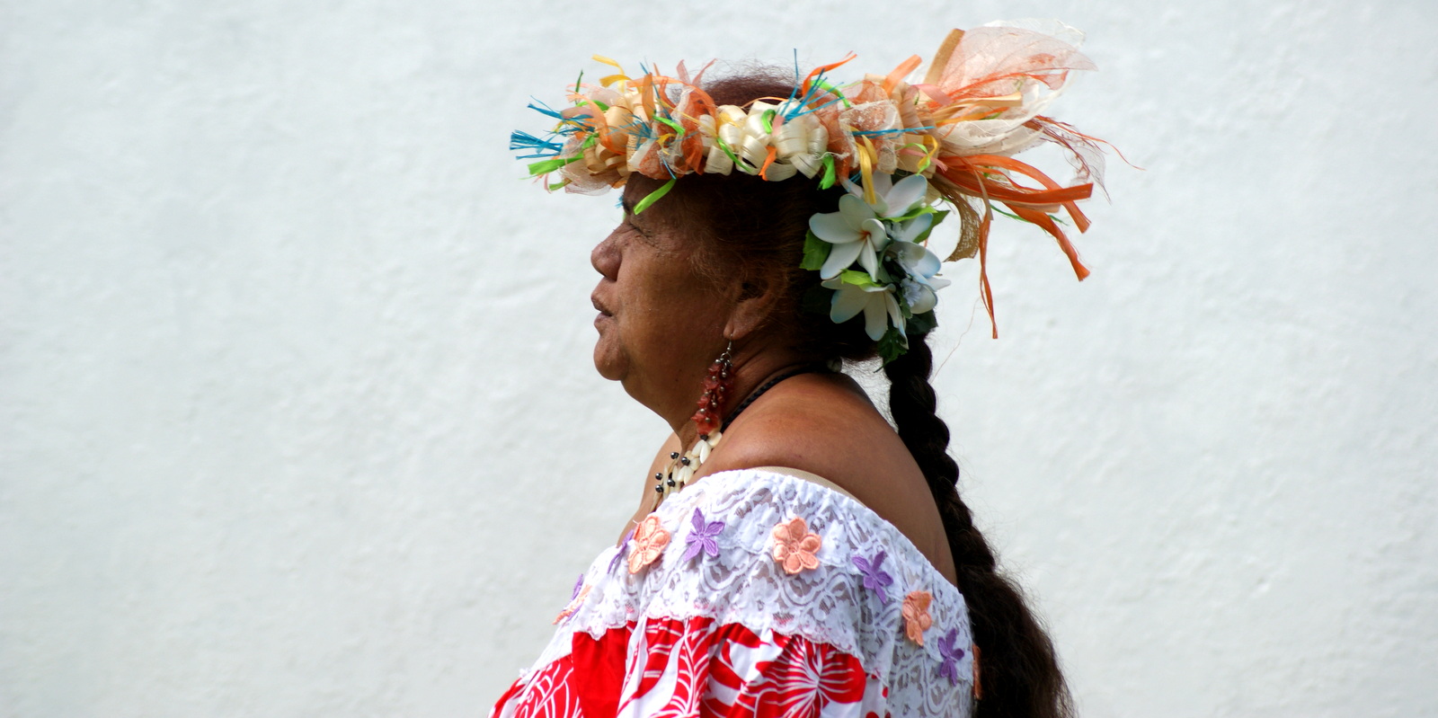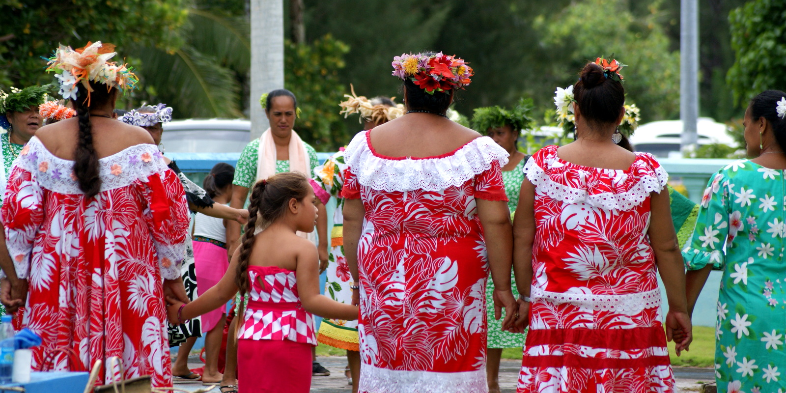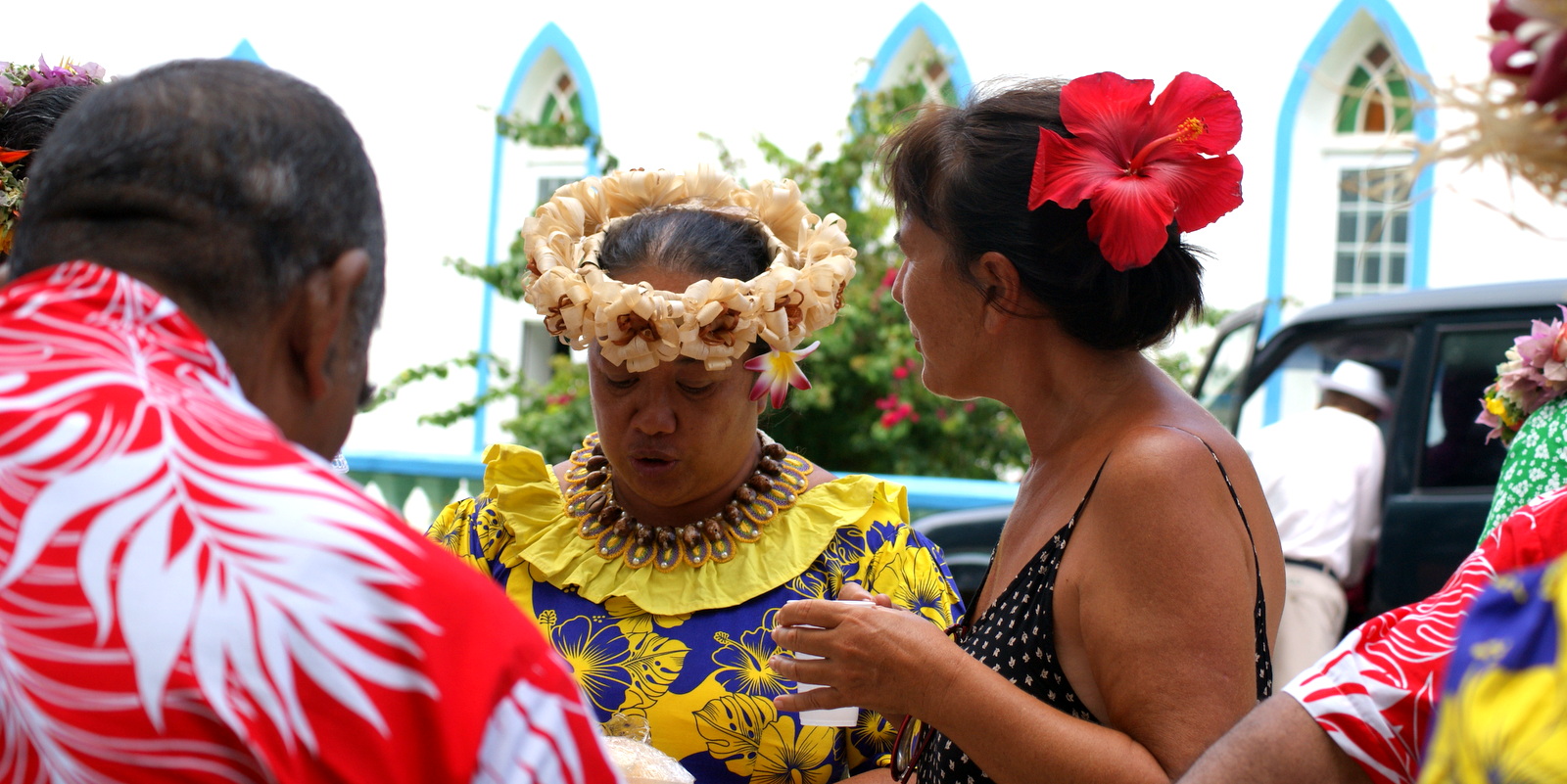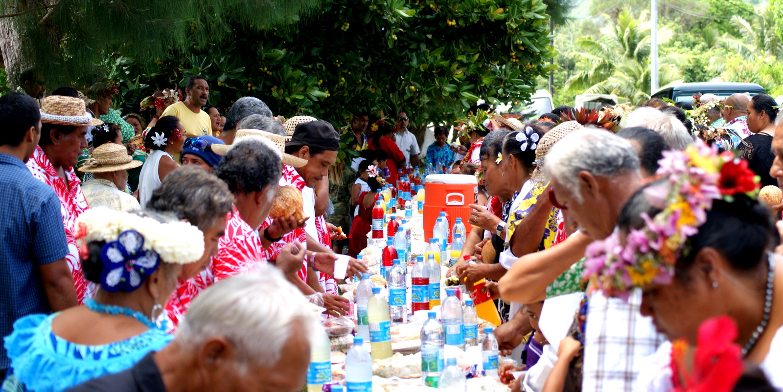 En plus d’une grande messe, un immense buffet est installé le long de la route où sont conviés tous les habitants. Pour cette occasion, tout le monde s’habille de circonstance: belle robe et couronne de fleurs ou chapeau pour les femmes, chemise à fleurs et chapeau pour les hommes…Une robe longue noire et un gros hibiscus du jardin dans un chignon pour moi, une chemise hawaïenne pour mon compagnon et nous voilà prêts à participer à la fête où nous sommes invités…