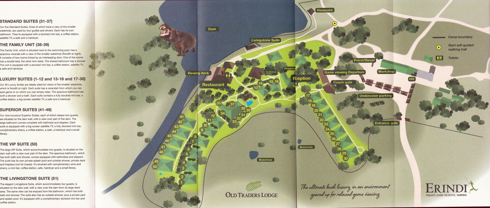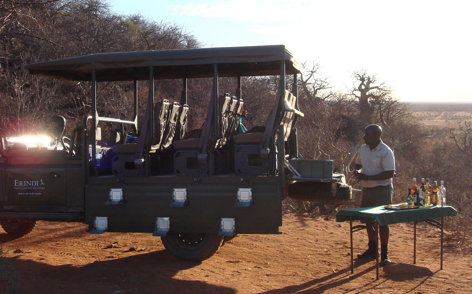 Si vous désirez séjourner à ERINDI, vous constaterez qu’il n’y a aucun tarif sur leur site et que vous ne l’obtiendrez qu’en les contactant. Des centrales de réservations hôtelières proposent des séjours à des prix variant du simple au double et le seul qui semble se situer dans la fourchette de prix la moins élevée est SAFARI NOW. Il peut donc être judicieux de comparer leurs tarifs avant de réserver et d’éviter le week-end pour obtenir les meilleures conditions.