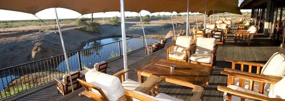 La terrasse du lodge, qui surplombe un immense plan d’eau où on peut observer les animaux se baigner et s’abreuver toute la journée, est vraiment un lieu d’exception pour prendre un verre entre amis… ( Une bouteille de sherry est offerte avec la suite…)