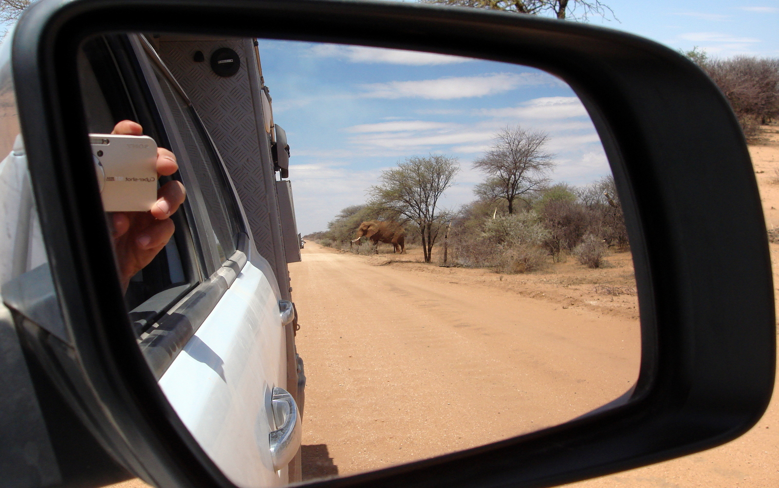 Et comme pour nous saluer une dernière fois, alors qu’on venait juste de sortir de la réserve, un énorme éléphant a surgi devant la voiture… Magie de l’Afrique !!!…