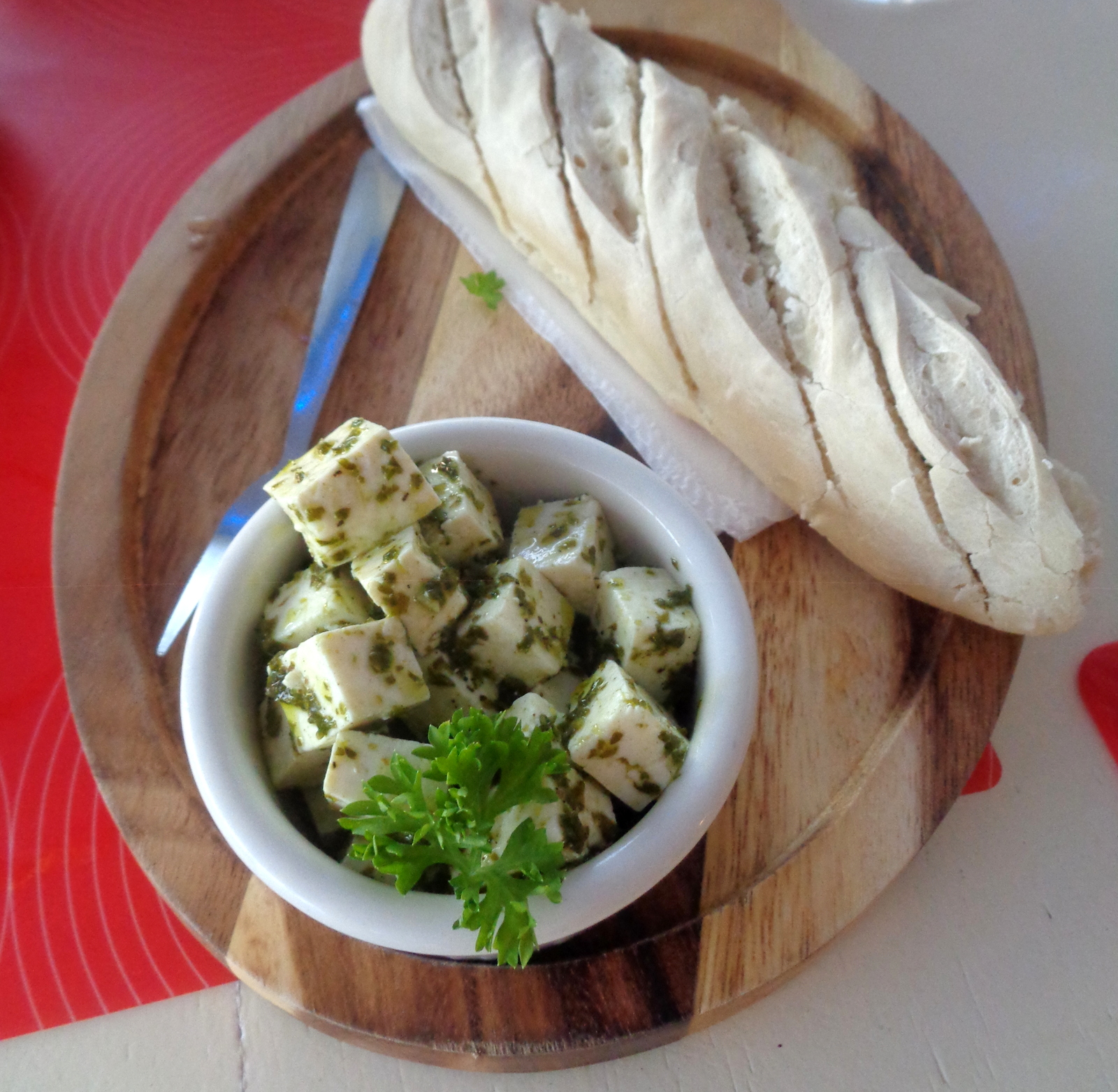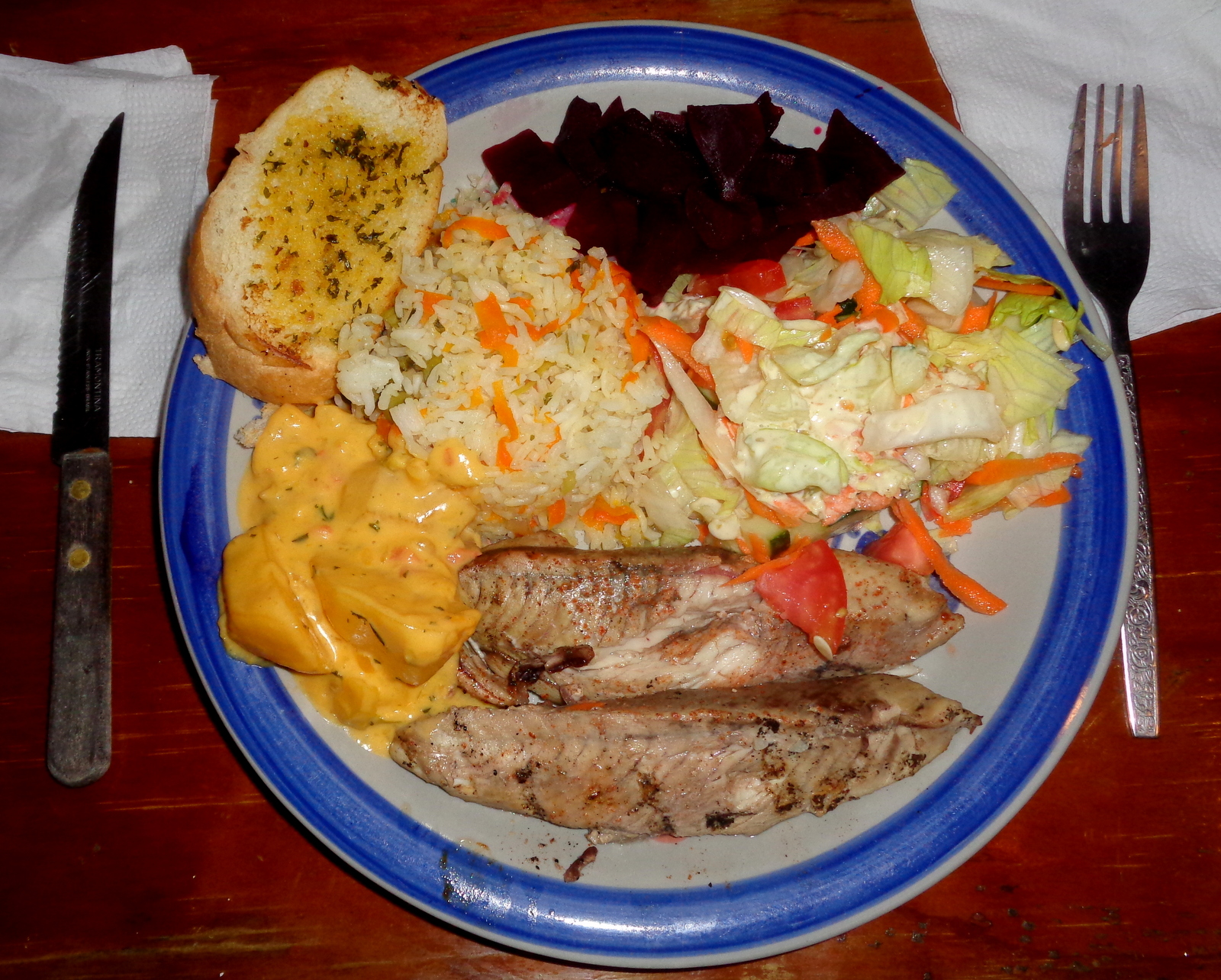 Notre dîner se composait d’une entrée de cubes de fromage mariné aux herbes avec une baguette de pain chaud, d’un plat de filet de rascasse, accompagné d’une bouteille de champagne (du vin mousseux argentin en fait…), le tout en face du coucher du soleil pour 41$ !!!