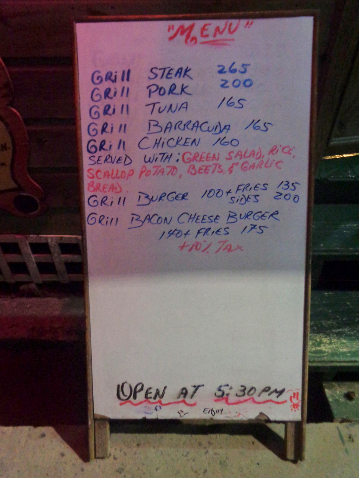 On avait lu que c’était à ne pas manquer, que le propriétaire et cuisinier concoctait tous les jours un menu unique et différent à inspiration thaï et qu’il fallait venir tôt parce qu’il refusait des clients tous les soirs… On se régalait donc d’avance de pouvoir enfin dîner asiatique après la déception du FOO KING WOK… En plus, on était passé devant le restaurant lors de notre journée découverte de l’île et l’endroit avait l’air plutôt sympa…