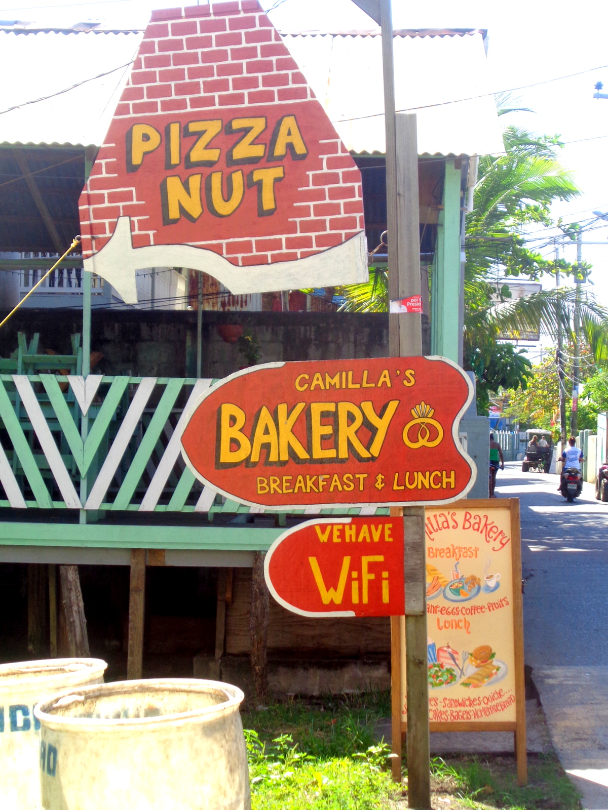 Boulangerie le matin et l’après-midi, pizzeria le soir. Ouvert dès 6h30 le matin et il faut y aller tôt pour avoir le choix car tout part très vite. Nombreuses sortes de pains et viennoiseries réalisées par un toulonnais installé sur l’île depuis une dizaine d’années. Prix européens: le croissant (énorme) à 60HNL (3$), le brownie au chocolat à 50HNL (2,5$)… mais c’est excellent et puis, le bonheur du croissant avec le café le matin n’a pas de prix !!!