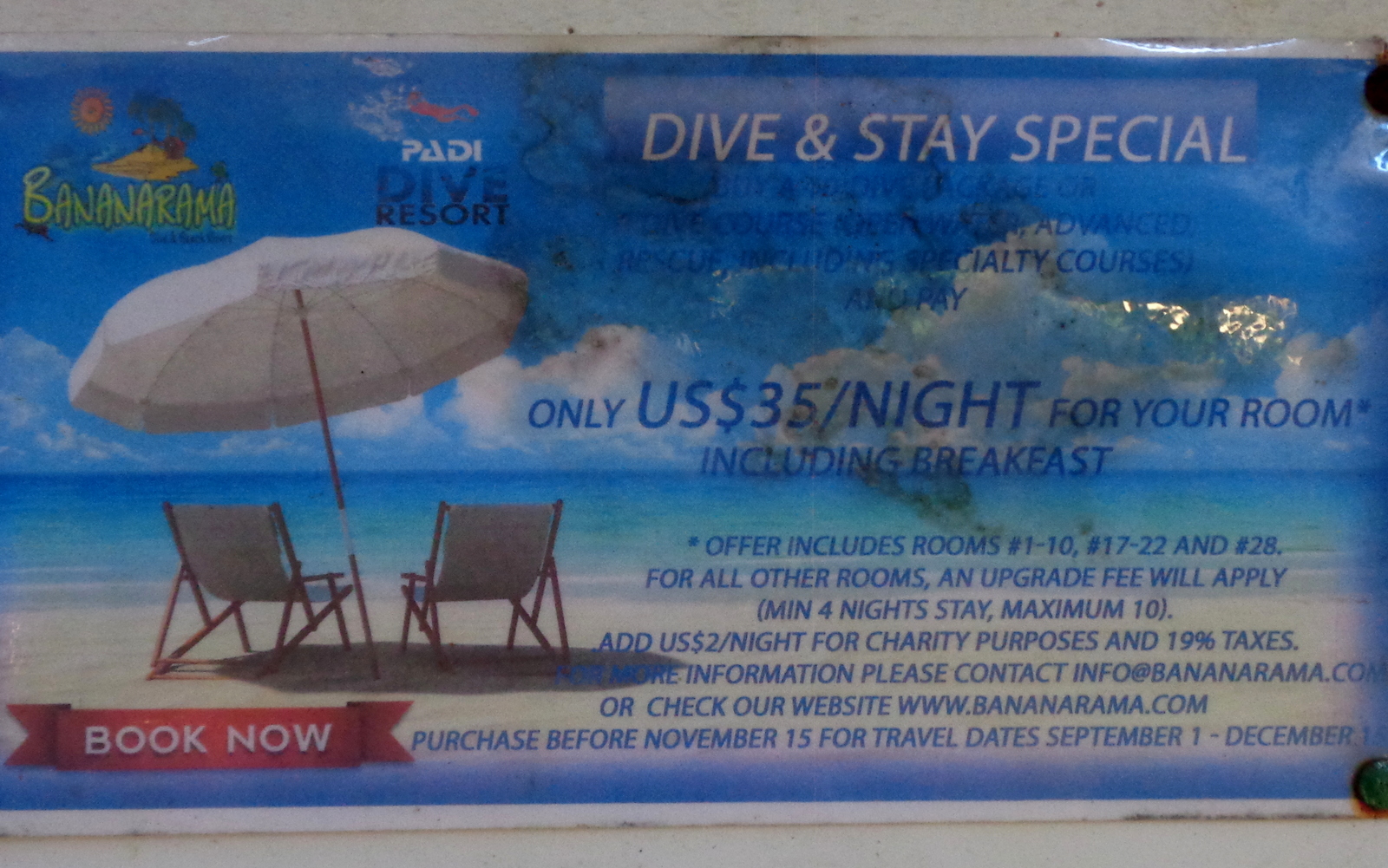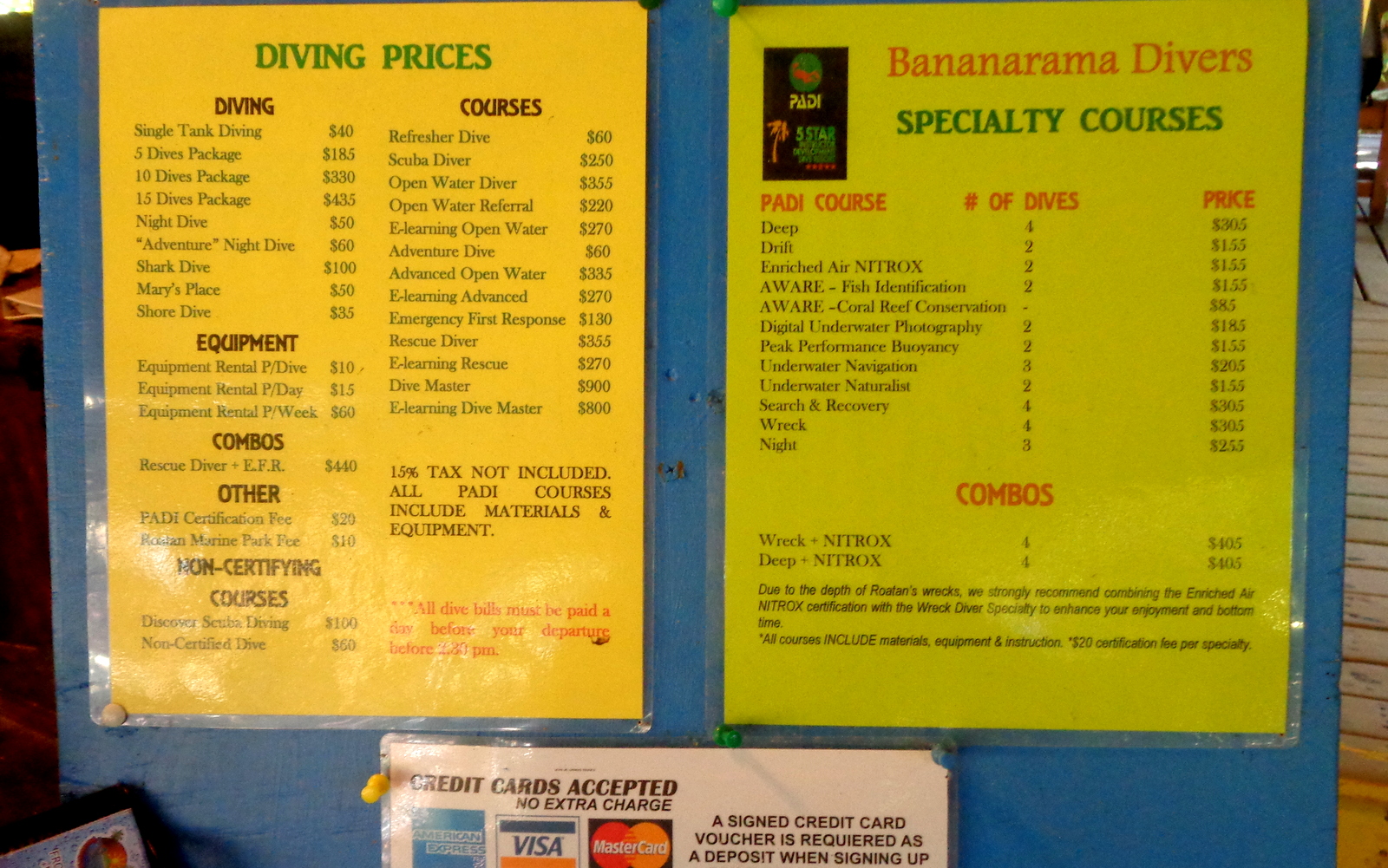 Quand on fait 2 plongées le matin, elles se succèdent avec un break d’une demi-heure entre… Ci-dessous la grille des tarifs… On a pris un pack de 10 plongées sur une semaine = 330$ + la location de l’équipement (gilet Fenzy et bouteilles)= 60$ + 15% de taxes= 449,50$.
