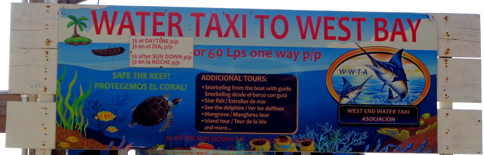 Pour se déplacer entre West Bay et West End quand on n’a pas de véhicule, il existe un service de bateau taxi qui navigue dans les 2 sens. 3$/ trajet/ personne jusqu’à 17h00, 5$ après.