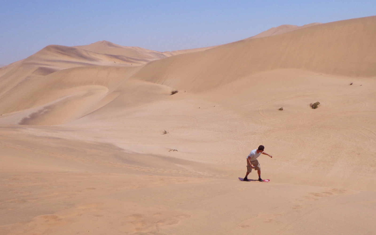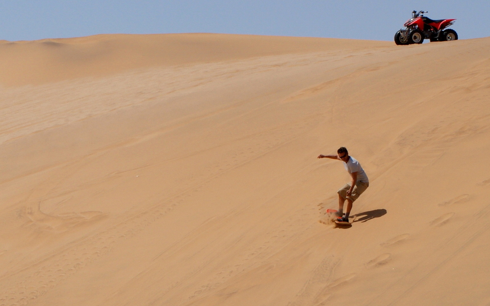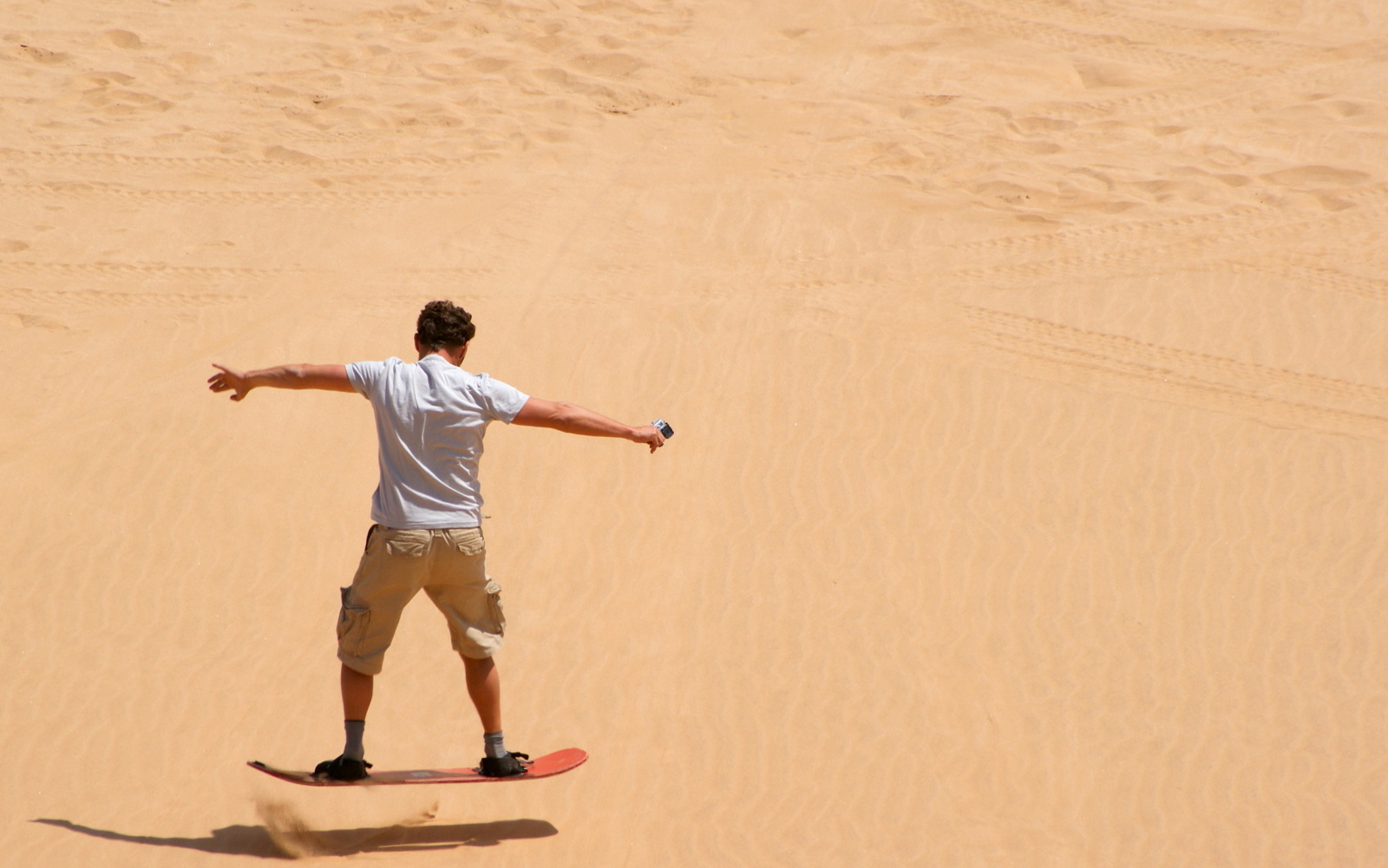 Le sand boarding est supposé se pratiquer sur la dune 7, une des premières dunes aux portes de la ville et la plus haute mais nous apprendrons que ce n’est plus possible suite à un accident mortel en 2013. L’activité a donc été reportée sur une dune plus petite et moins pentue…