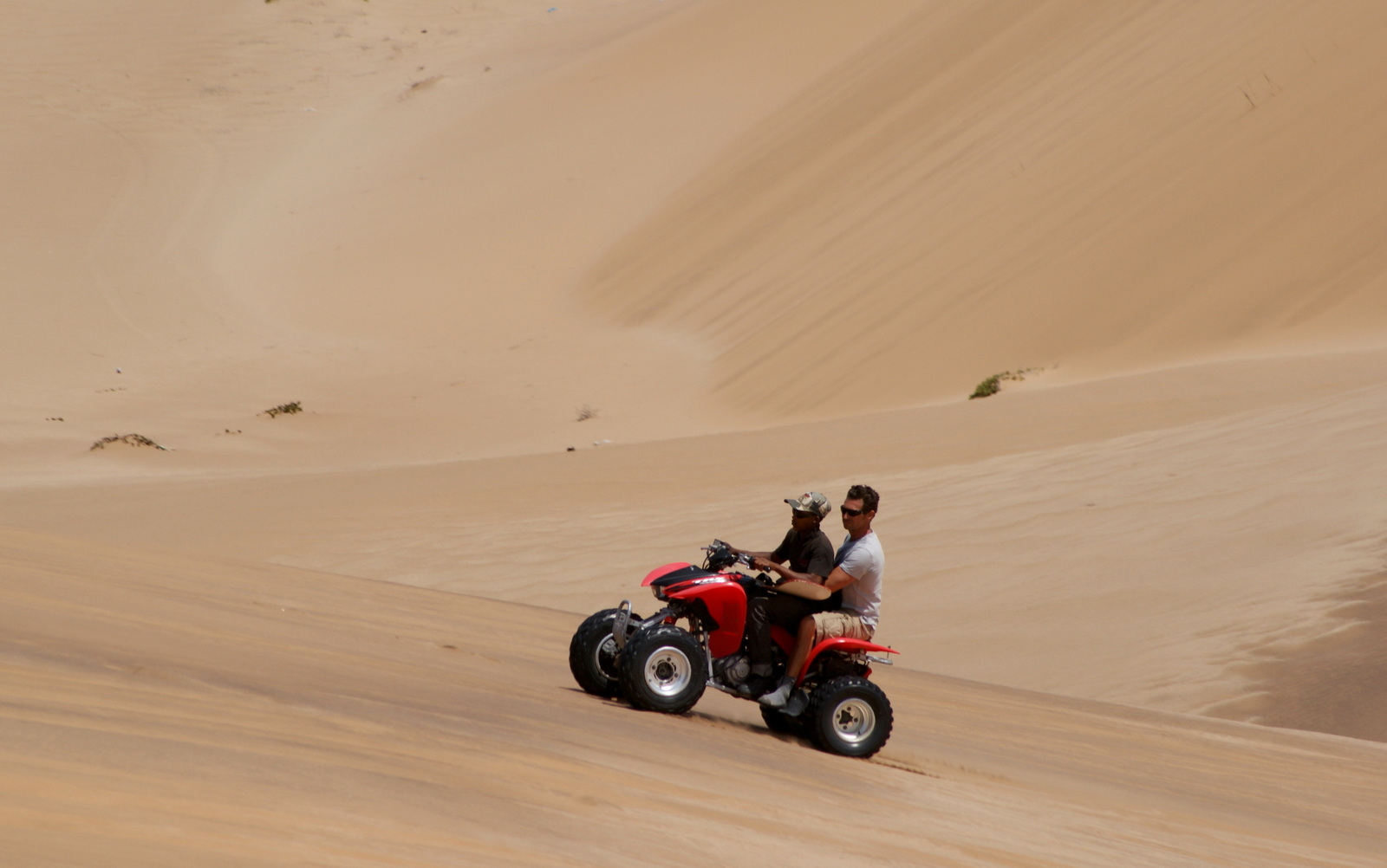 On peut descendre la dune à plat ventre ou debout sur un surf. Pour les observateurs dont je suis, on peut attendre au restaurant ou suivre sur un quad pour 150NAD. Je choisis de suivre et mon ami, surfeur, choisit le surf debout. Surprise, on lui demande de retirer ses chaussures et de chausser le surf en chaussettes !!! Il a droit à 6 descentes avec remontées de la dune en quad pour 490NAD (environ35€)…