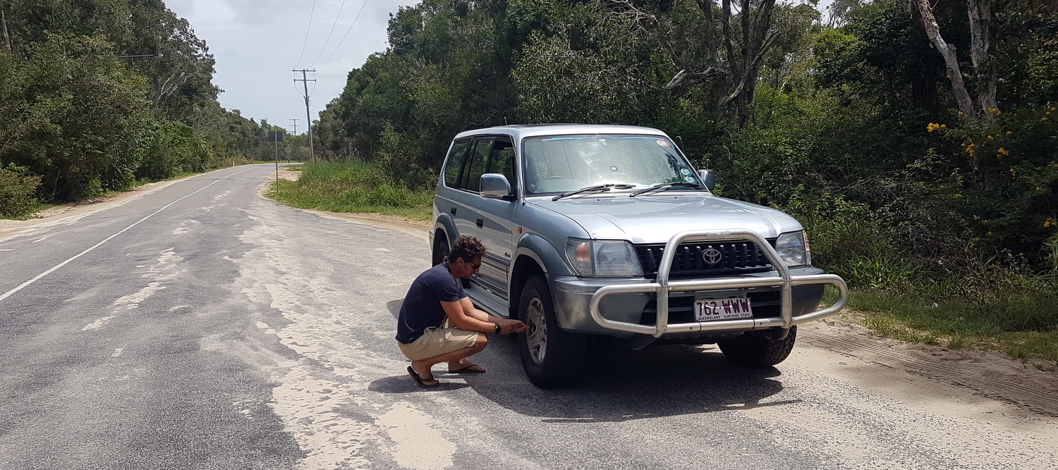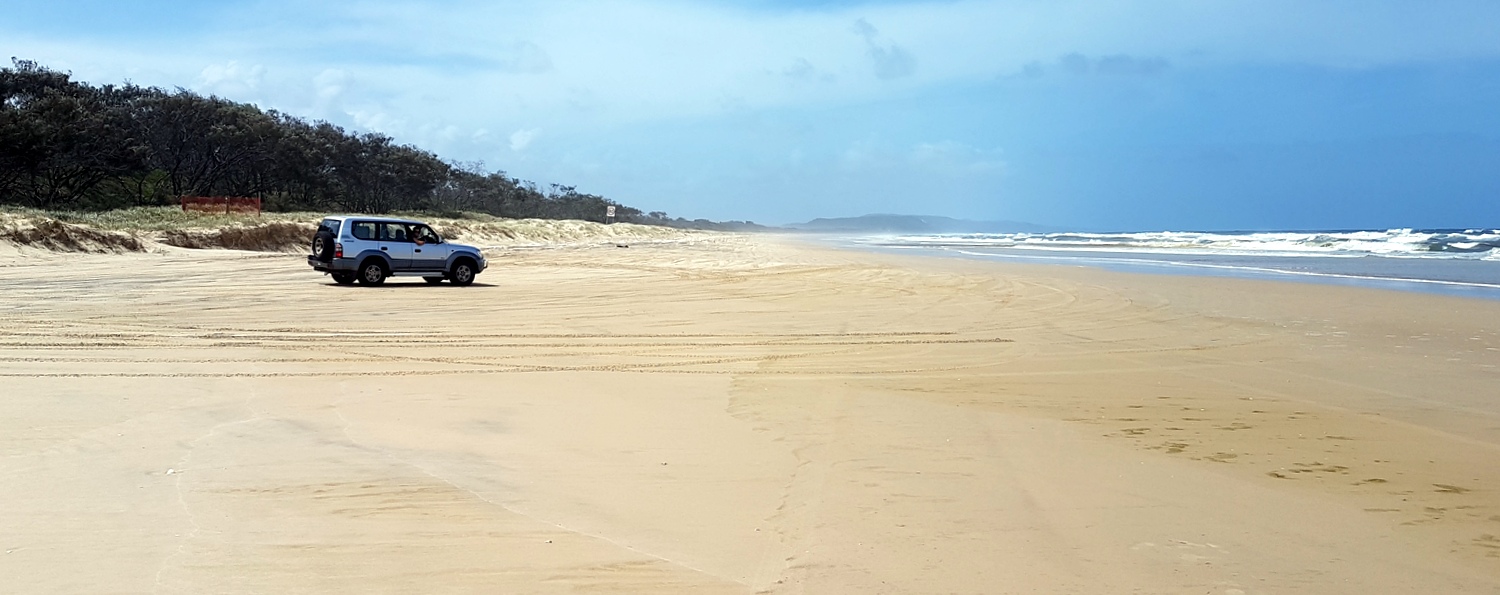Notre SUV n’étant vraiment pas adapté, on a loué un Toyota Land Cruiser Prado à Noosa en fin de matinée (aux alentours de 11h30) puis on  a emprunté la Great Beach Drive jusqu’à Inskip Point pour prendre le ferry sur Fraser. On a passé tout l’après-midi, la journée du lendemain et la matinée du surlendemain sur l’île pour en repartir par le ferry de 15h00. On a visité puis dormi à Rainbow Beach et on en est reparti toujours par la Great Beach Drive au lever du soleil pour Noosa…