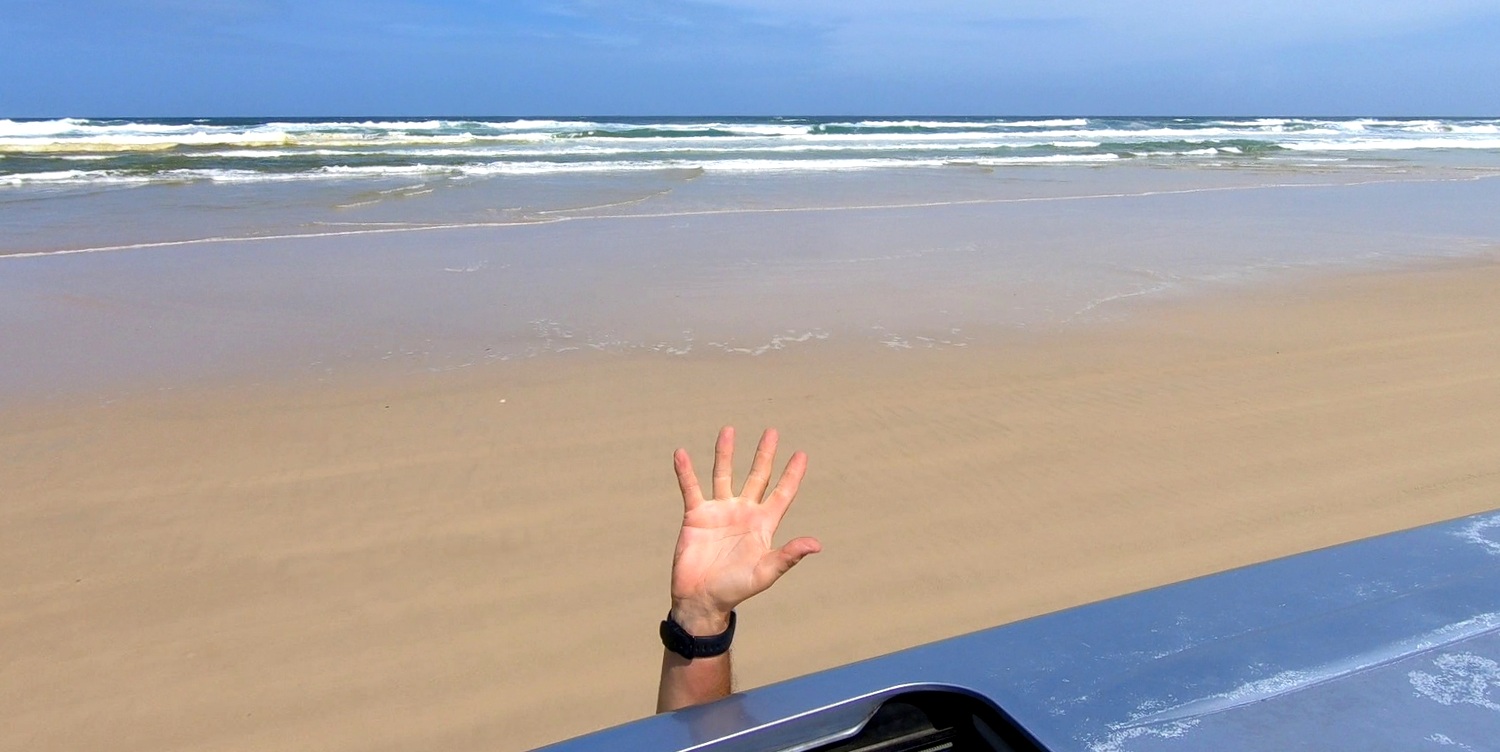 Même sur la plage, on n’oublie pas qu’on roule à gauche et si on croise les véhicules qui arrivent en face sur la droite, ne pas oublier de mettre son clignotant pour ne pas risquer un accrochage !!!