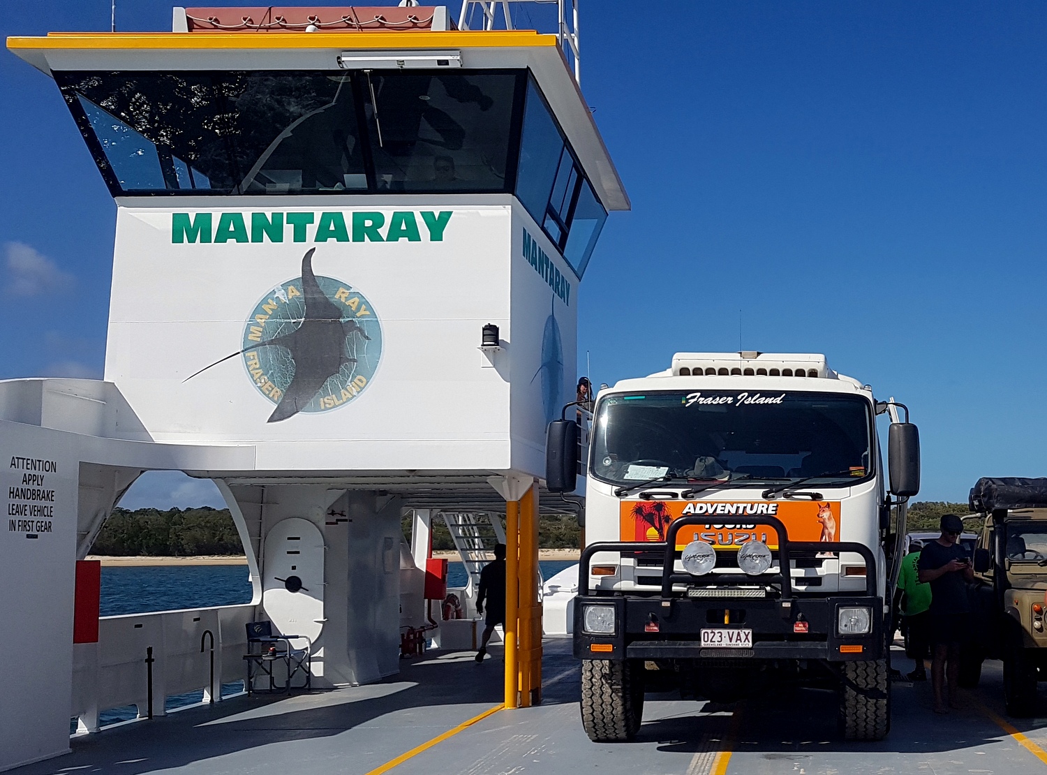 En fait, c’est quand la barge ( Manta Ray) arrive, qu’on voit où est son départ. On embarque à la queue leu leu, un peu comme on veut et on paie soit à bord (cartes de crédit acceptées) ou au bureau, le MANTA RAY BARGE & PERMIT OFFICE au 66, Rainbow Beach Road à Rainbow Beach qui est ouvert tous le jours de 7h00 à 15h00. On peut y acheter aussi le permis pour Fraser.