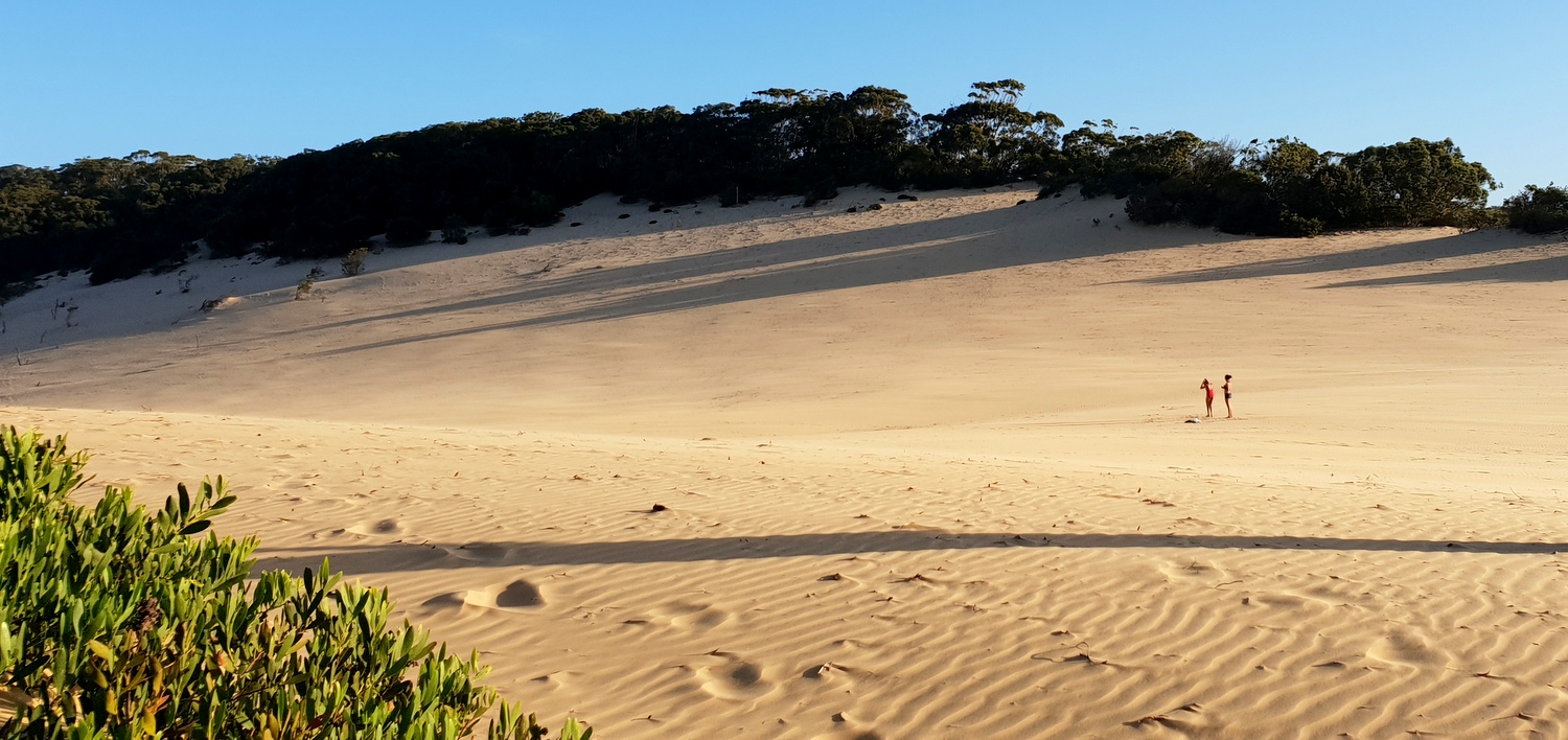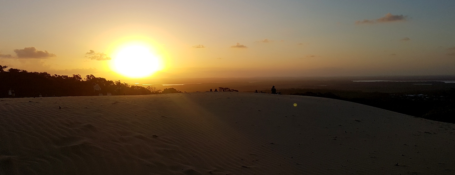 C’est la « dune du Pilat » australienne, une masse de sable d’une superficie de 15 hectares qui surplombe la mer à 129m d’altitude( contre 106m pour le Pilat!). Comme de nombreux visiteurs et locaux, on y est allés pour assister au coucher du soleil sur l’ouest mais on peut aussi assister au lever du côté est !!!