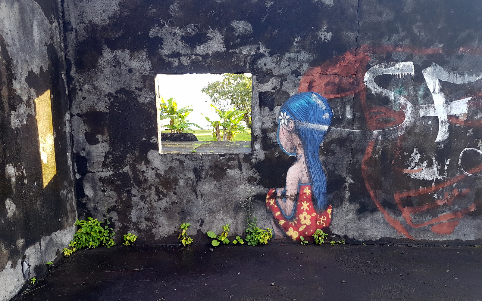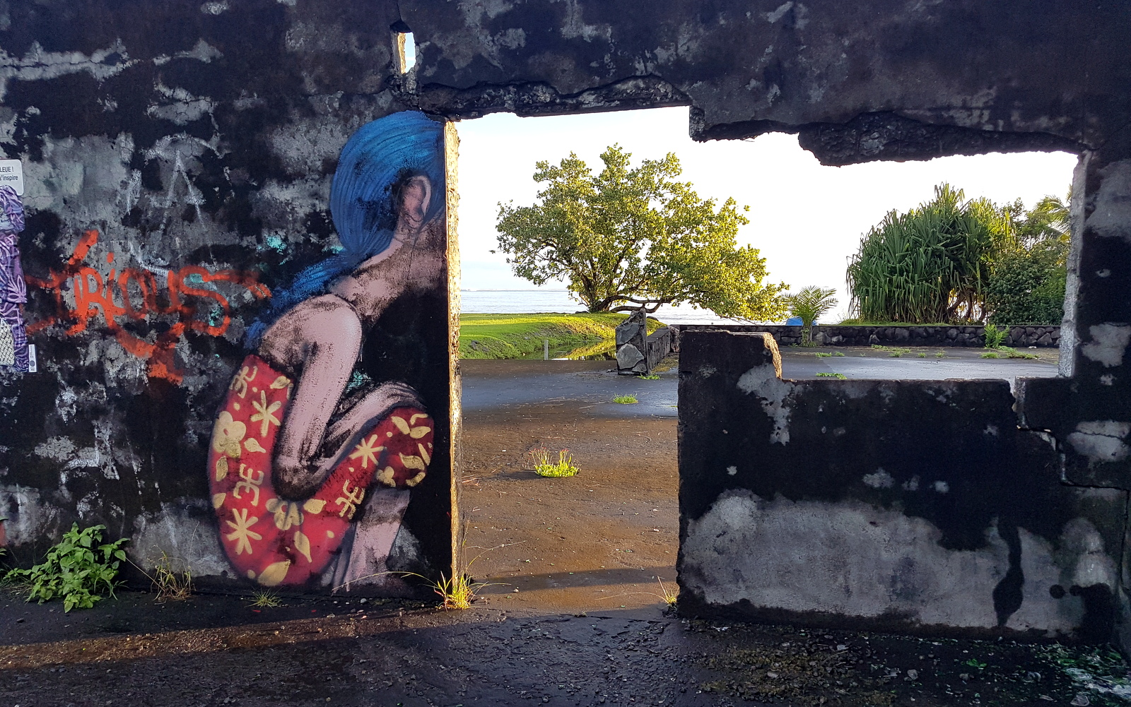 La fresque « Fenêtre sur Lagon » a été peinte sur les murs d’une maison abandonnée et c’est juste magnifique… S’il a plu, le terrain autour de la ruine devient marécageux, soyez prudents !!! Il n’y a pas de borne kilométrique pour se repérer, il faut donc visualiser son compteur kilométrique… La maison est juste avant une grande surface alimentaire sur la droite en venant du sud…