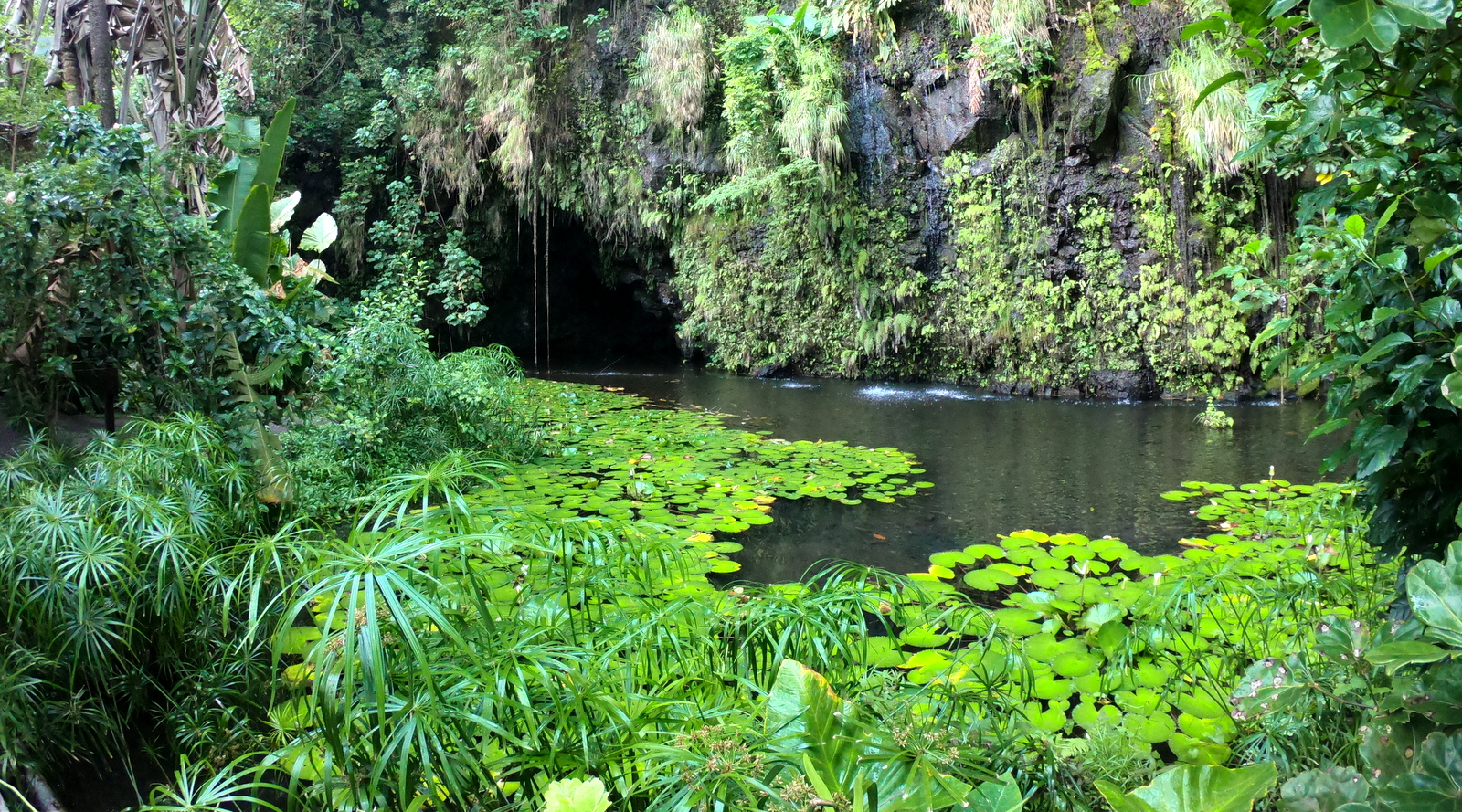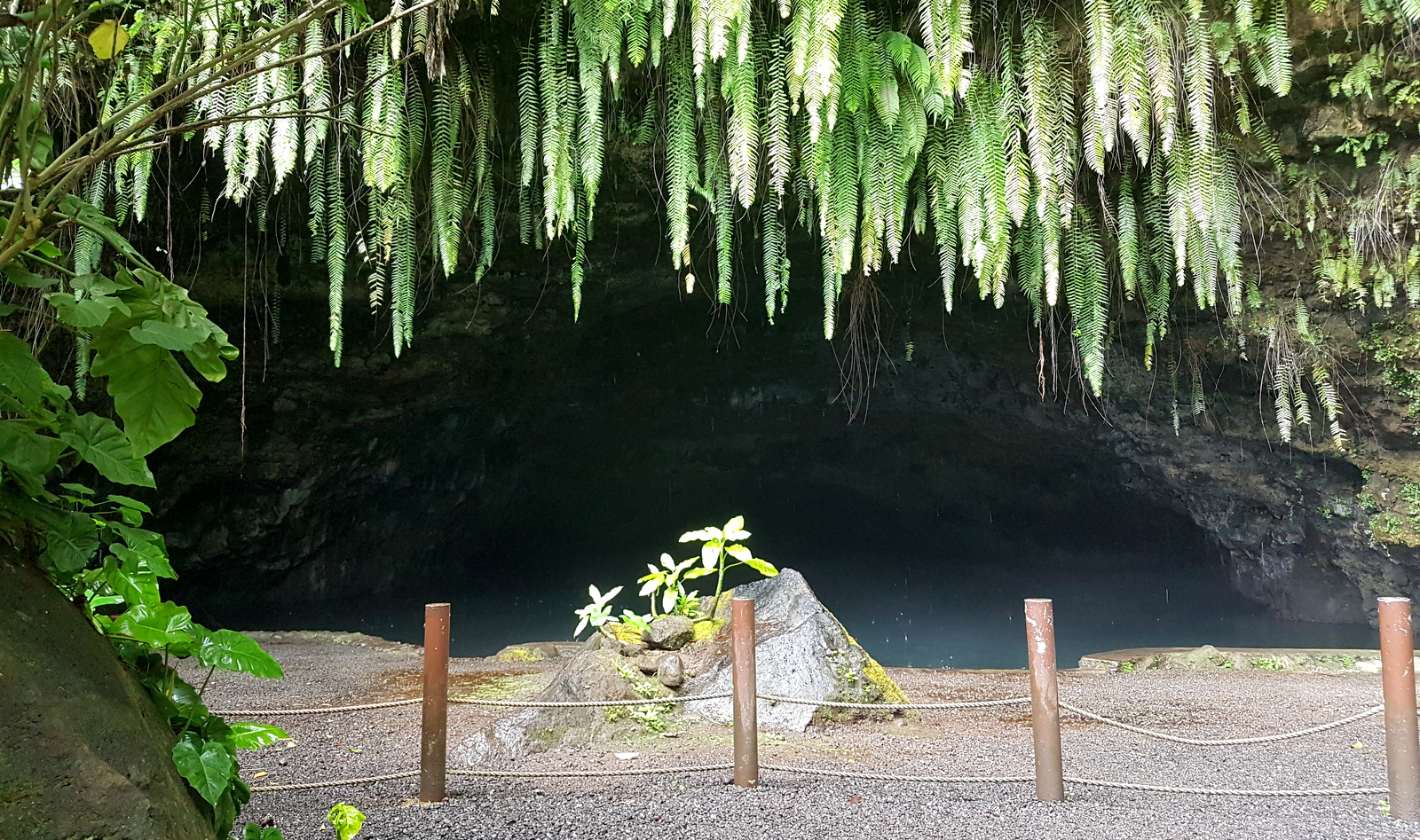 En fait, on en voit surtout 2: celle avec la grande voûte sur la gauche et celle avec la cascade sur la droite. La 1ère et la plus grande a l’air vraiment mystérieuse avec sa voûte et ses grandes fougères qui la cachent en partie. La 2ème est plus paradisiaque avec son environnement tropical qui lui donne un air de publicité pour un bain douche…