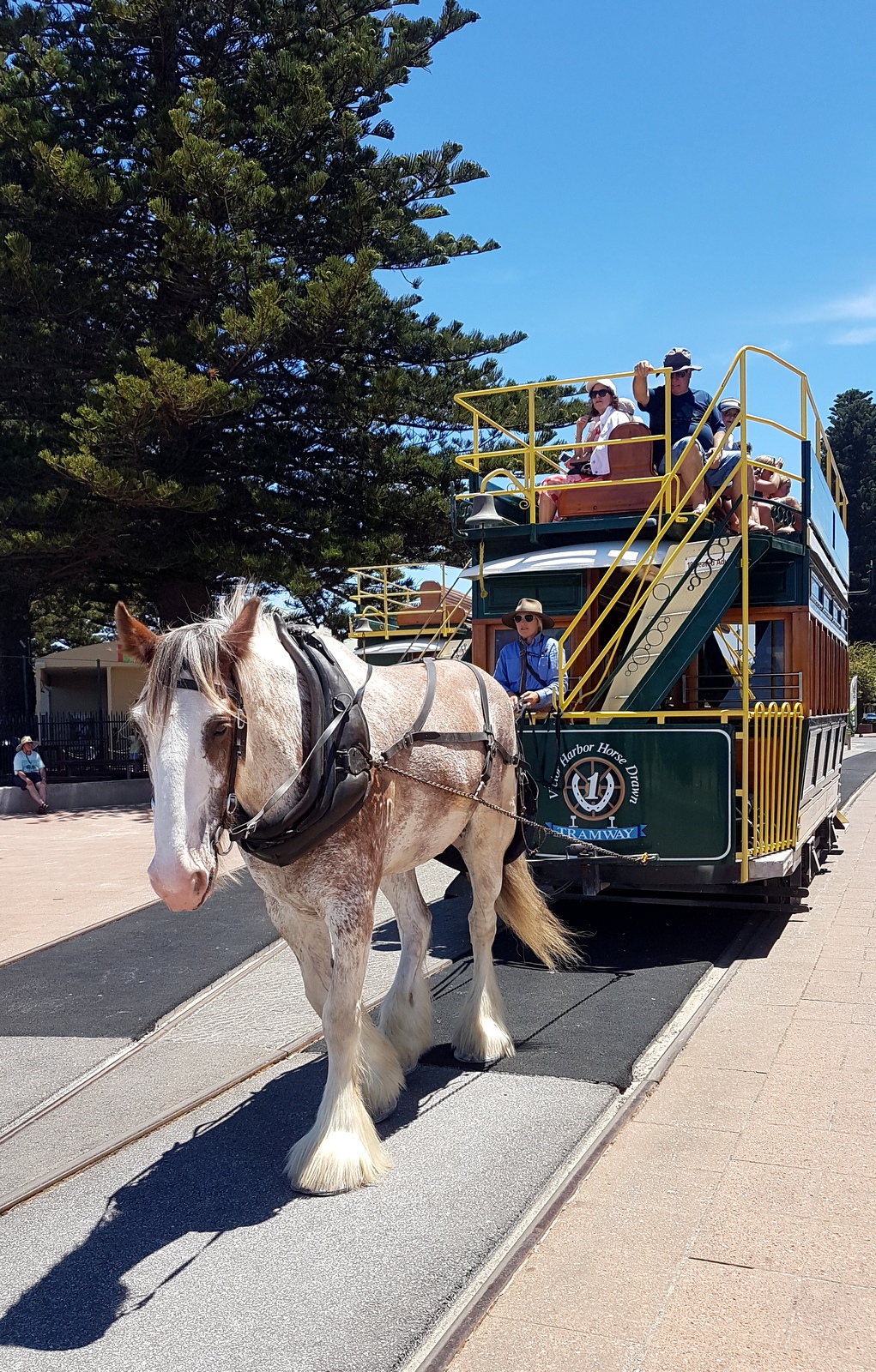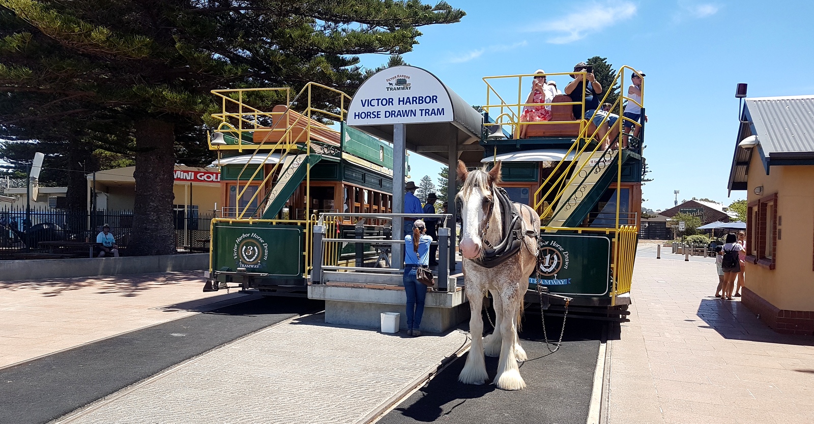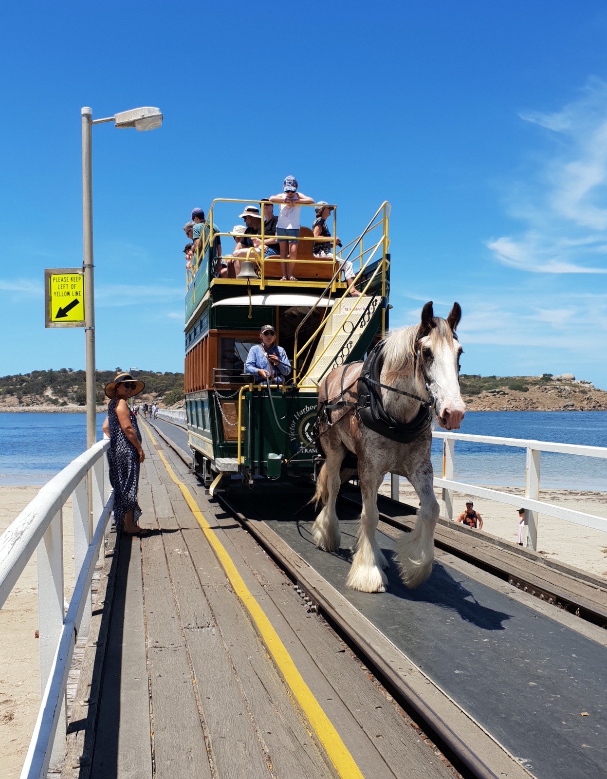 Pour parcourir cette jetée, the Causeway, interdite aux voitures, et accéder à Granite Island, on peut évidemment, marcher ou prendre un des derniers trams tiré par des chevaux encore en opération dans le monde. Ce moyen de transport est en utilisation depuis 1894!